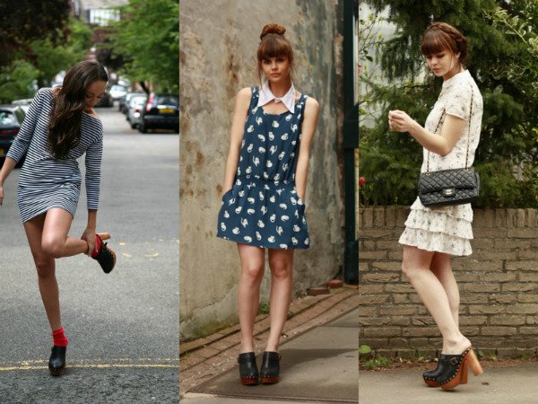 In particular, clogs are worn under short dresses, complementing with shoes a delicate, romantic bow. There is no ban on the selection of various types of clogs, under certain styles of dress. Only one rule works here: to choose plain clogs for printed dresses and vice versa.