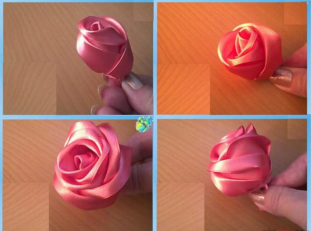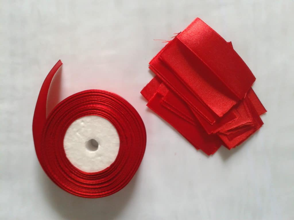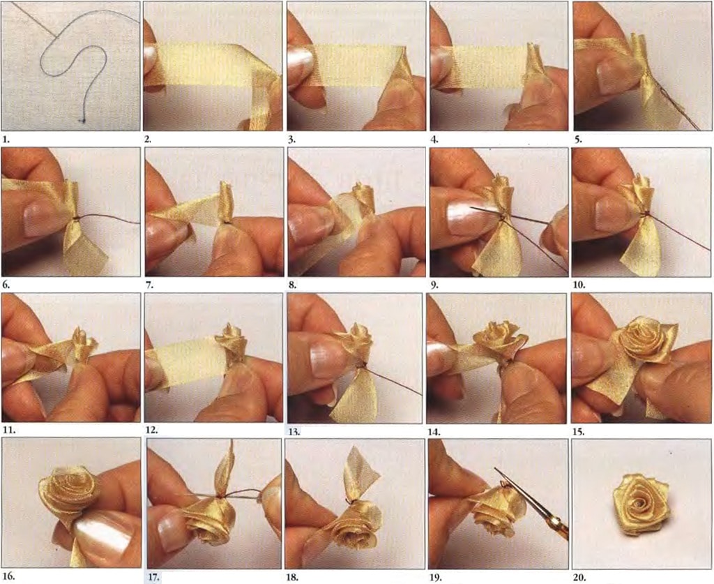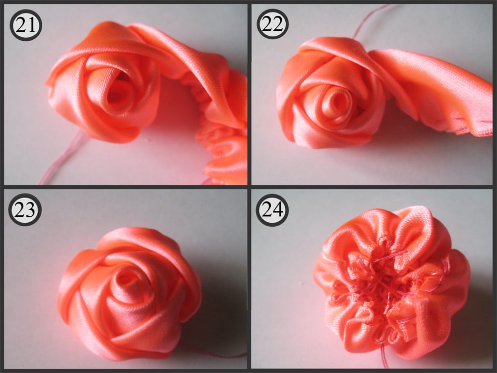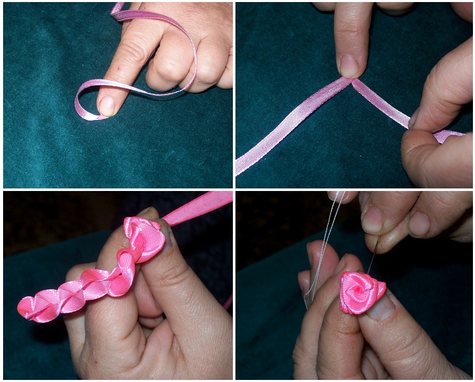 Also, one of the ways to create a rose can be folding the ribbon, stitching one edge in a circle.