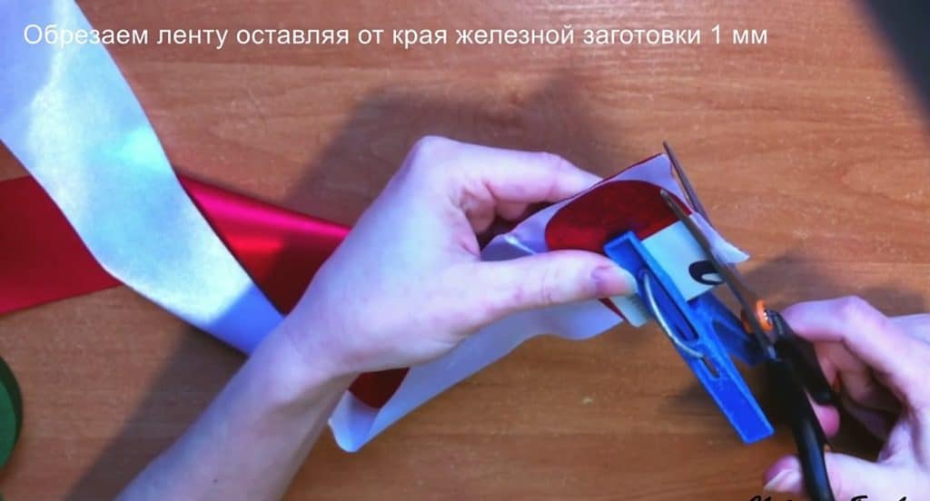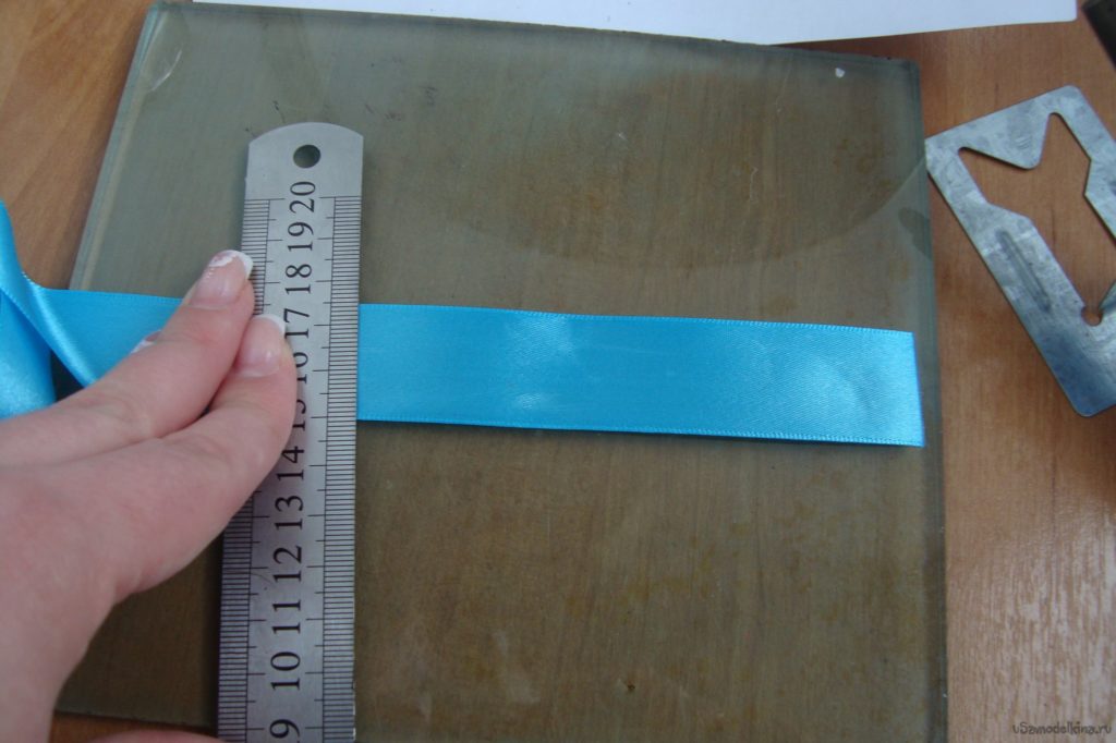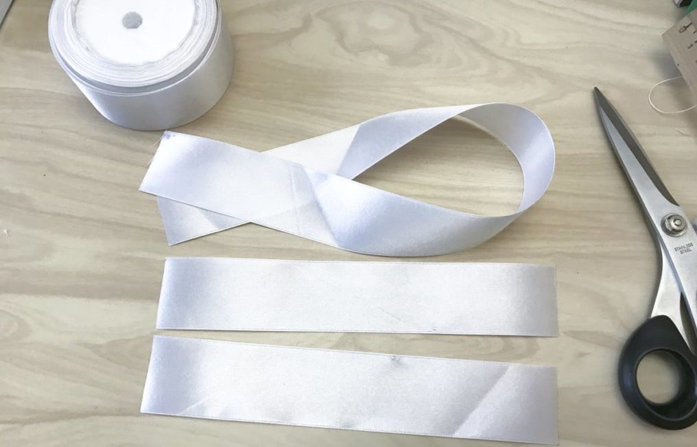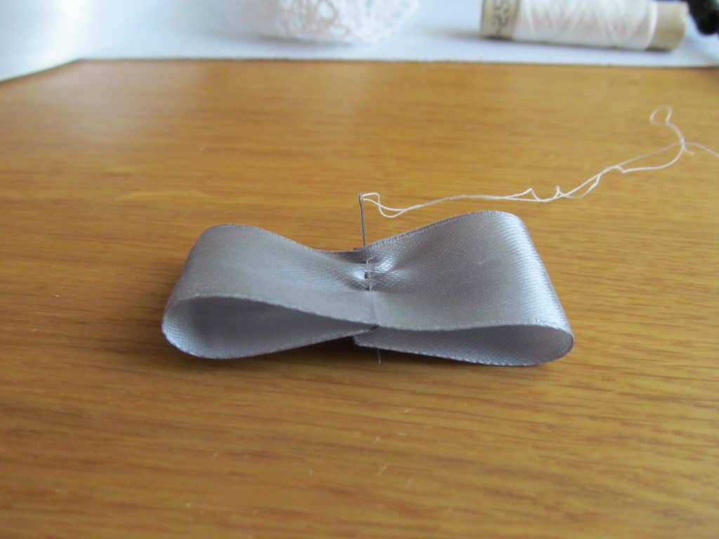 We fold the ribbon on the floors and sew the edges, after which we tighten the bow in the middle with a thread so that it looks like a butterfly.