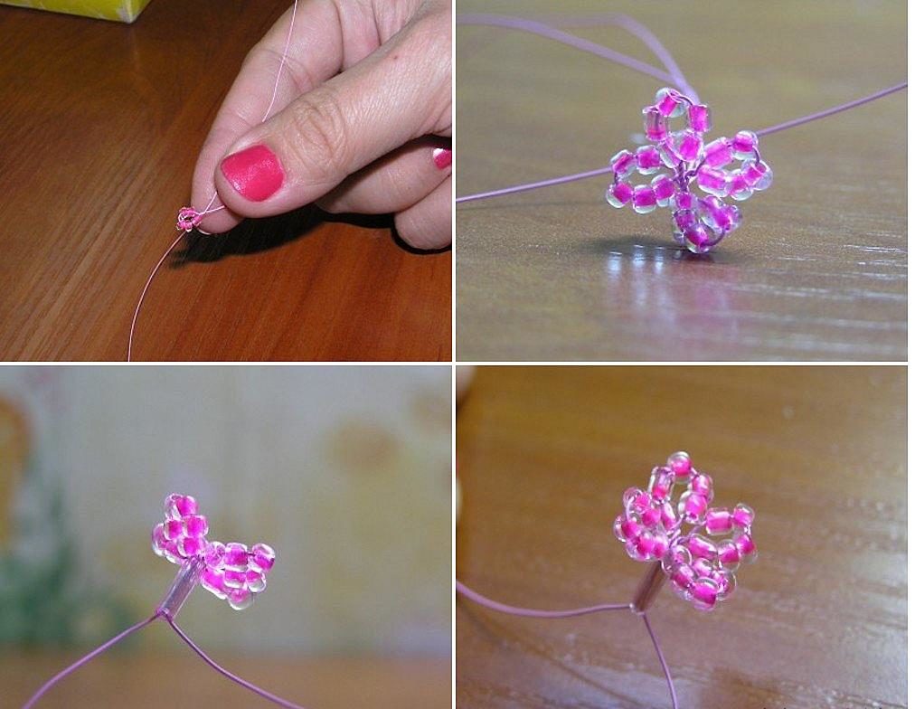 Then dial 6 beads again and thread through the first one that was scored this time so you will get 2 petals, continuing to make several flowers according to the same pattern.