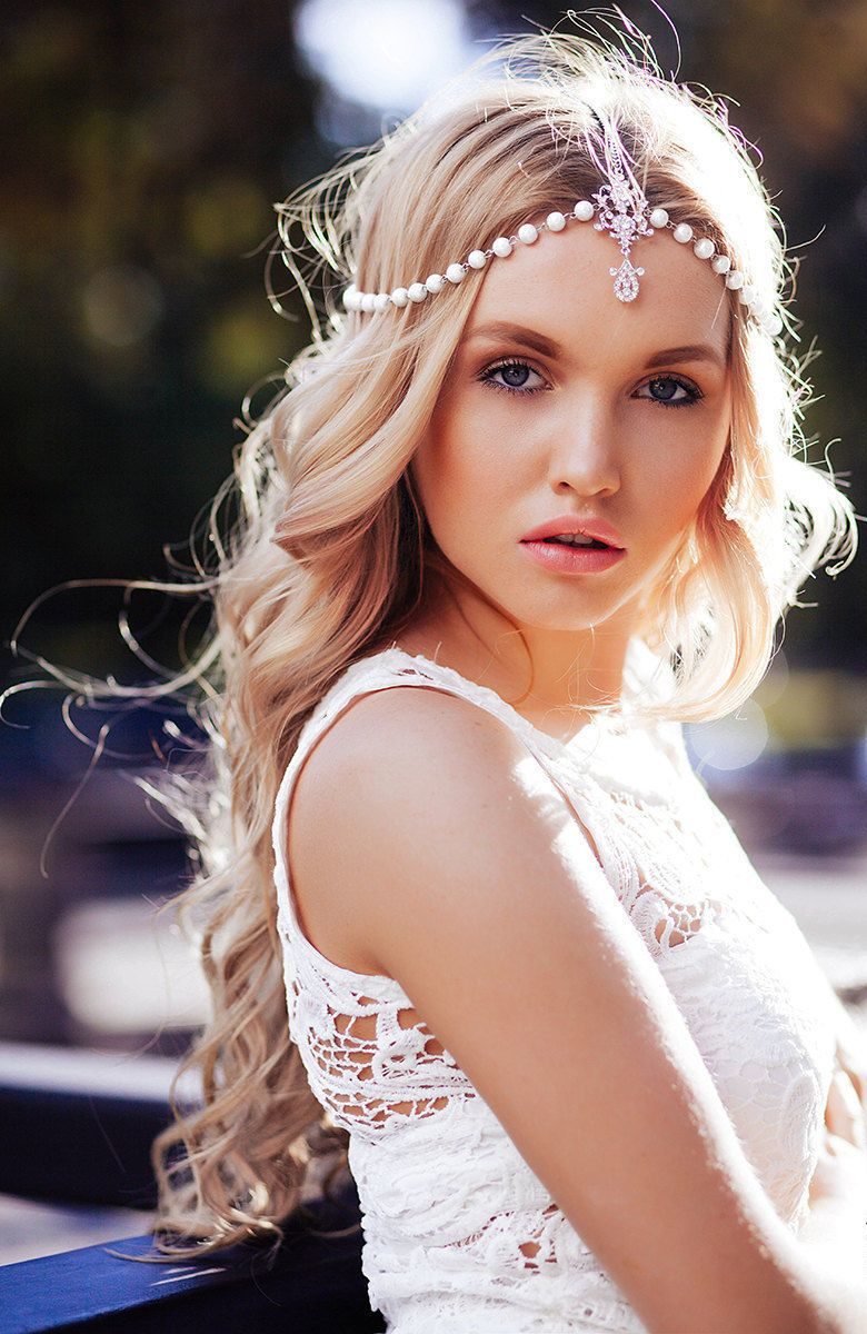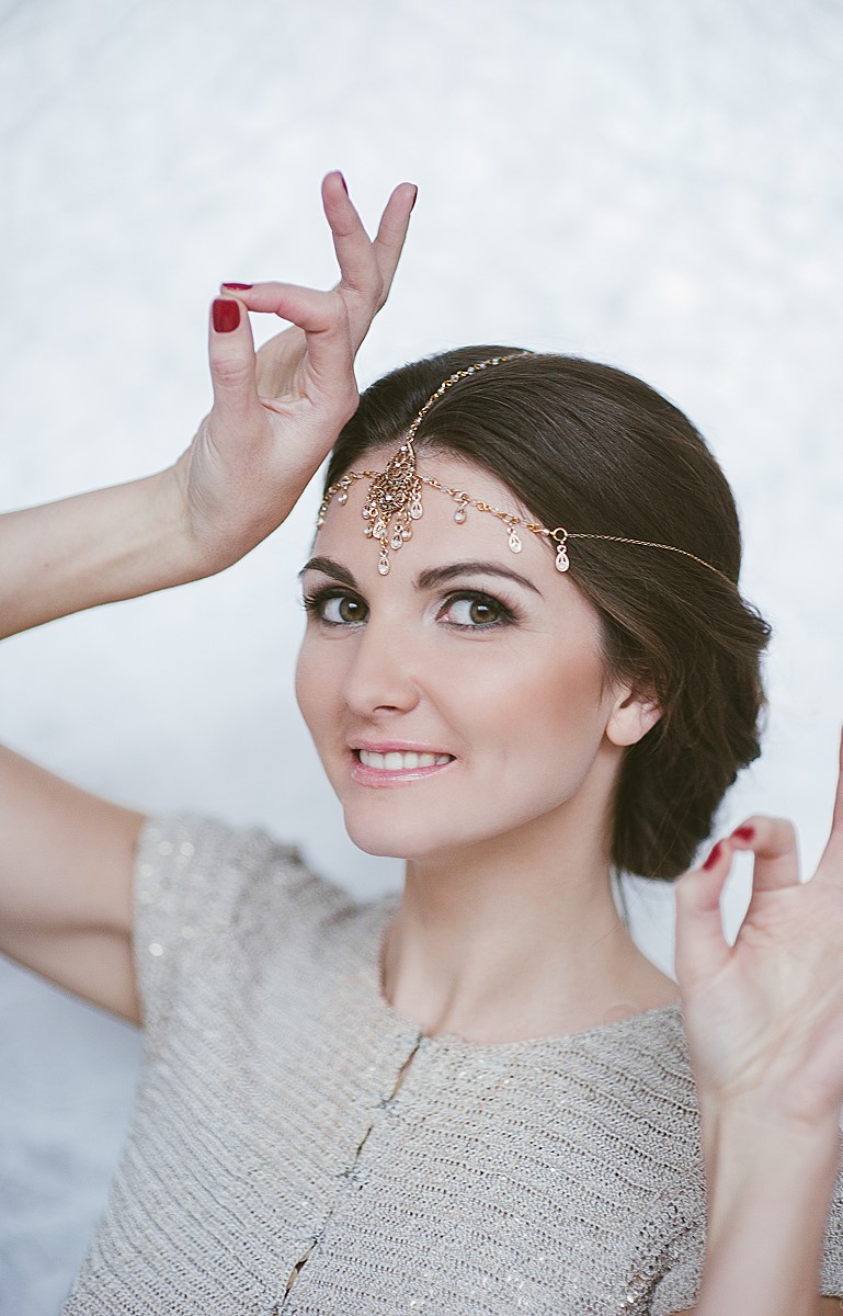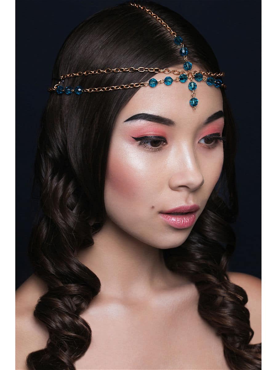 Mysteriously and extraordinary, the beads on chains look like they are worn as a hair ornament.