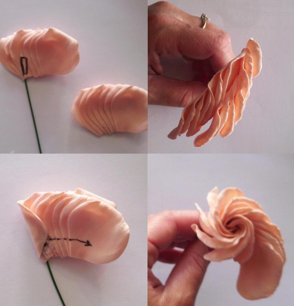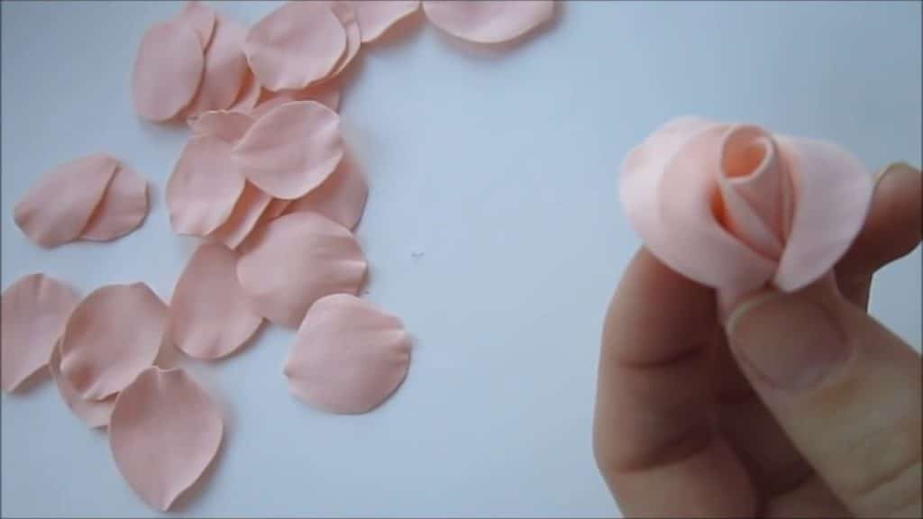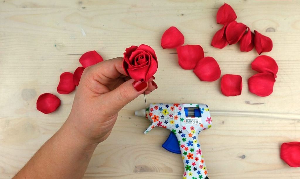 When we see that the material has become plastic, we twist our petal into a tube and straighten it. Thanks to these actions, the petals will be curved and more realistic. Then we fix our petals each subsequent on top of the previous one, with glue.