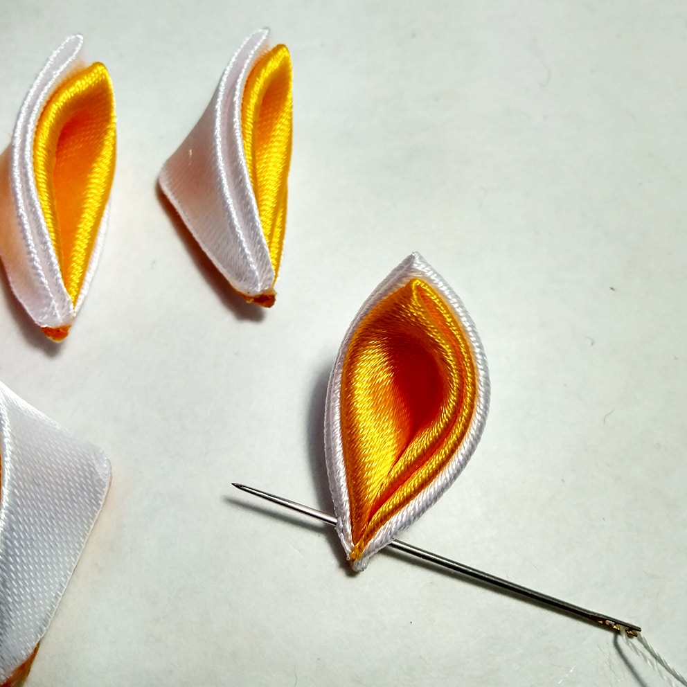 When the part is ready to create volumes, we sew two petals along the upper edge and turn the seam inward. Then at the bottom base we make a few stitches and slightly tighten the base of the petal.