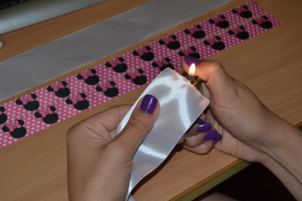 Then we gently burn the edges of our segment with a lighter, while holding the cloth with tweezers so as not to burn our hands.