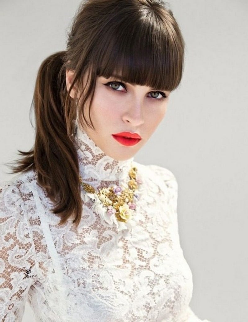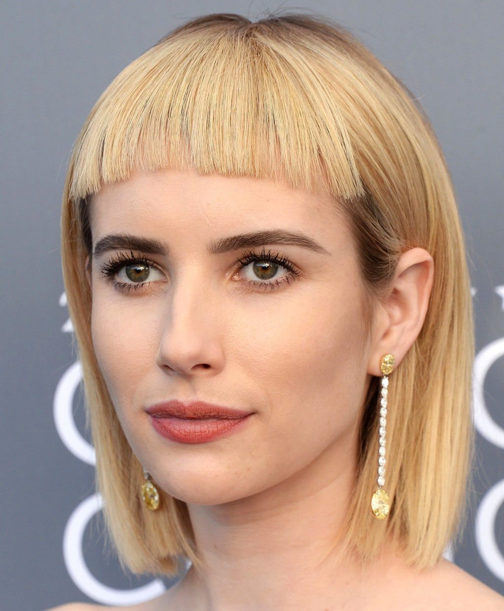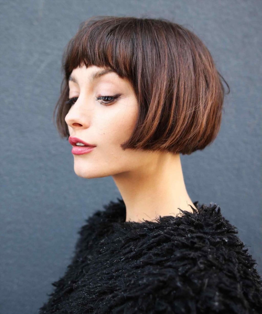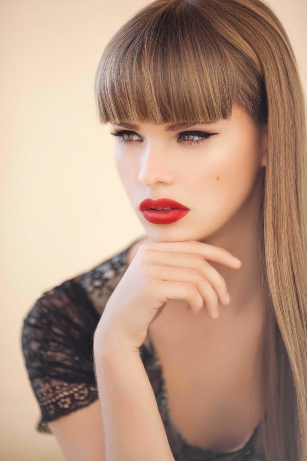 To achieve a similar bang effect, it is leveled with an iron. A straight bang can give the look a certain severity, and it always focuses on the lips. Therefore, it is worth paying special attention to lip makeup.