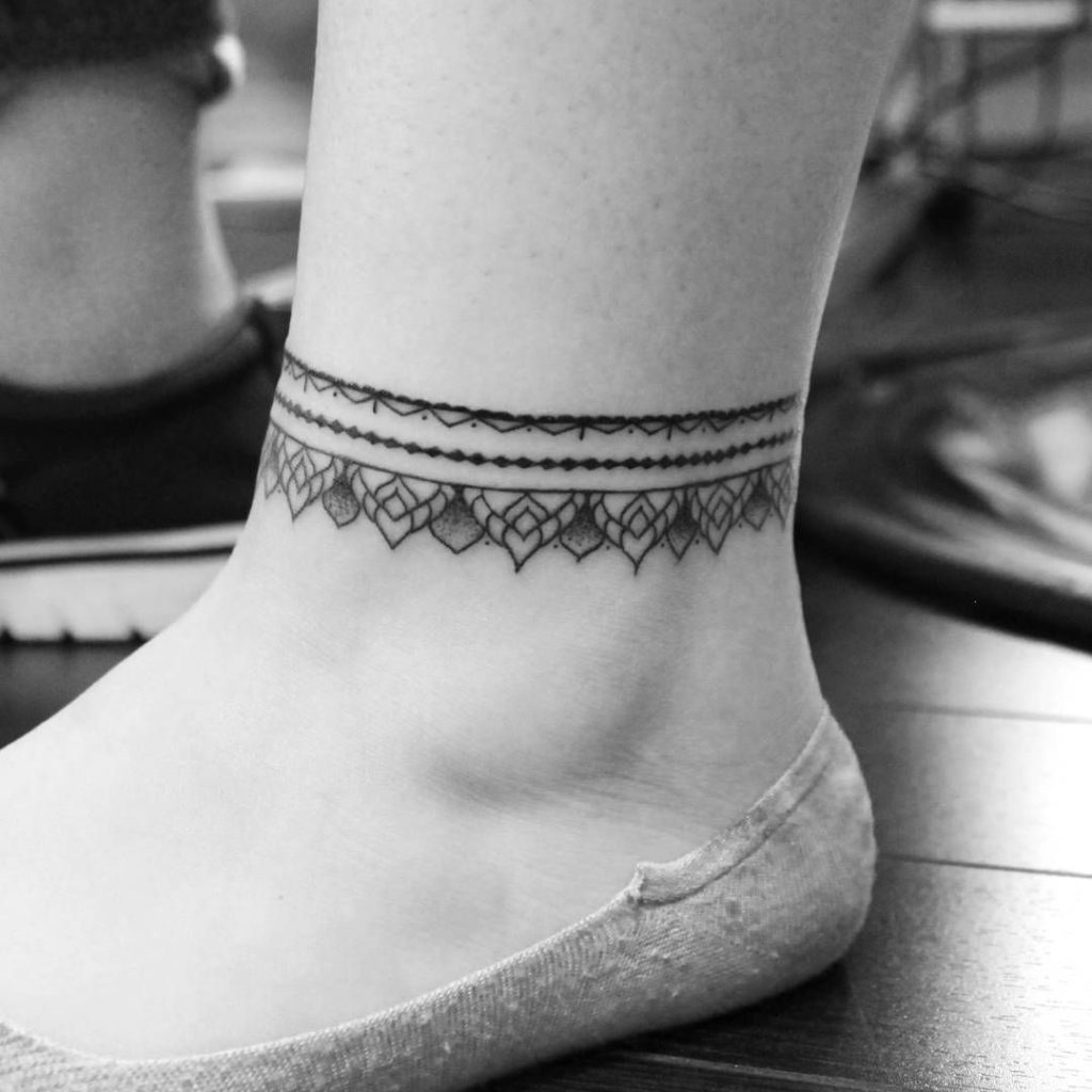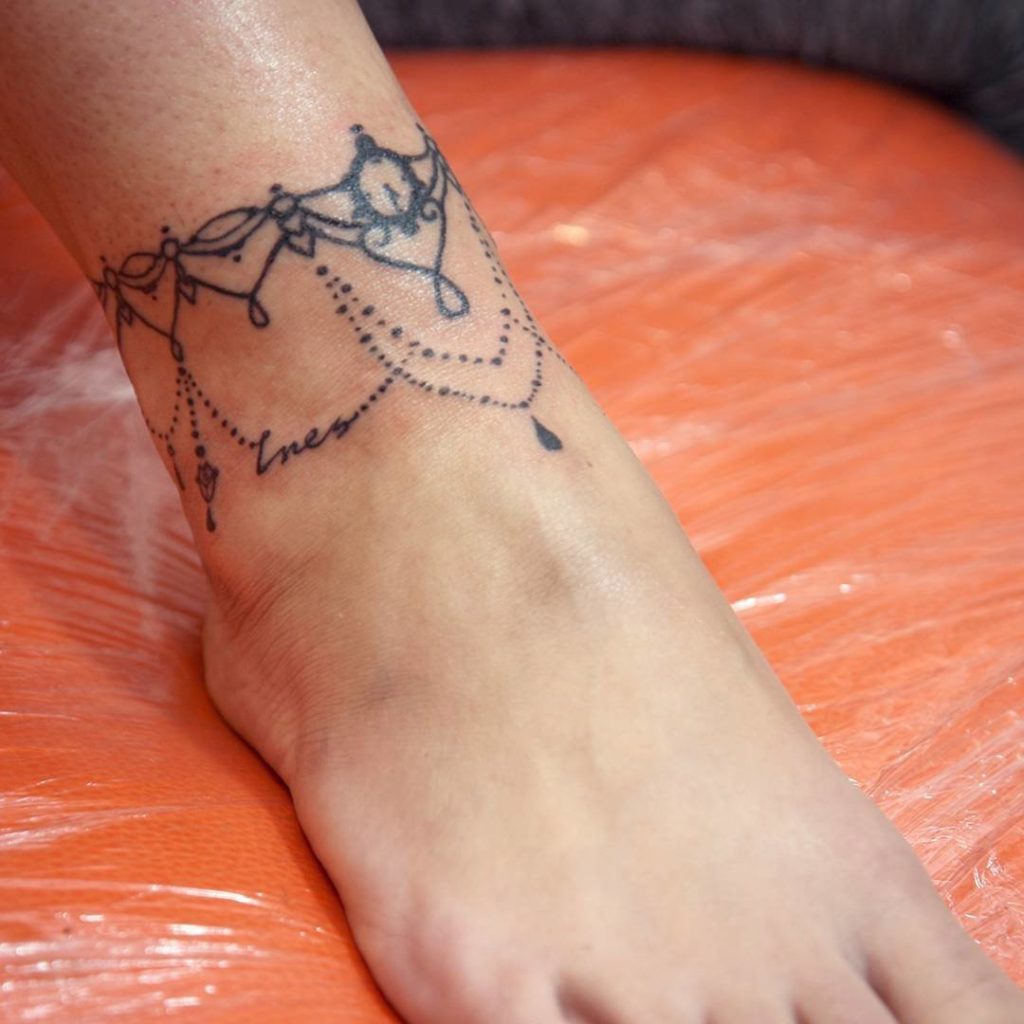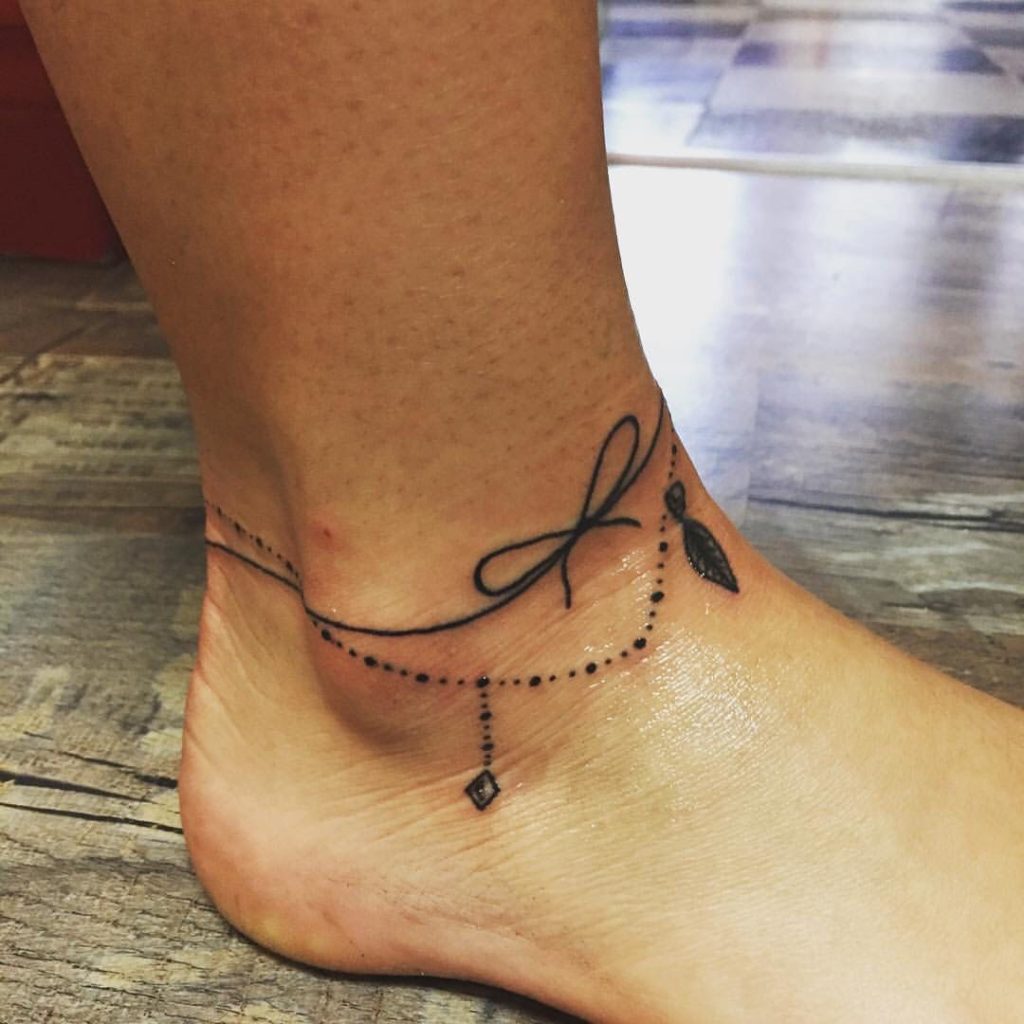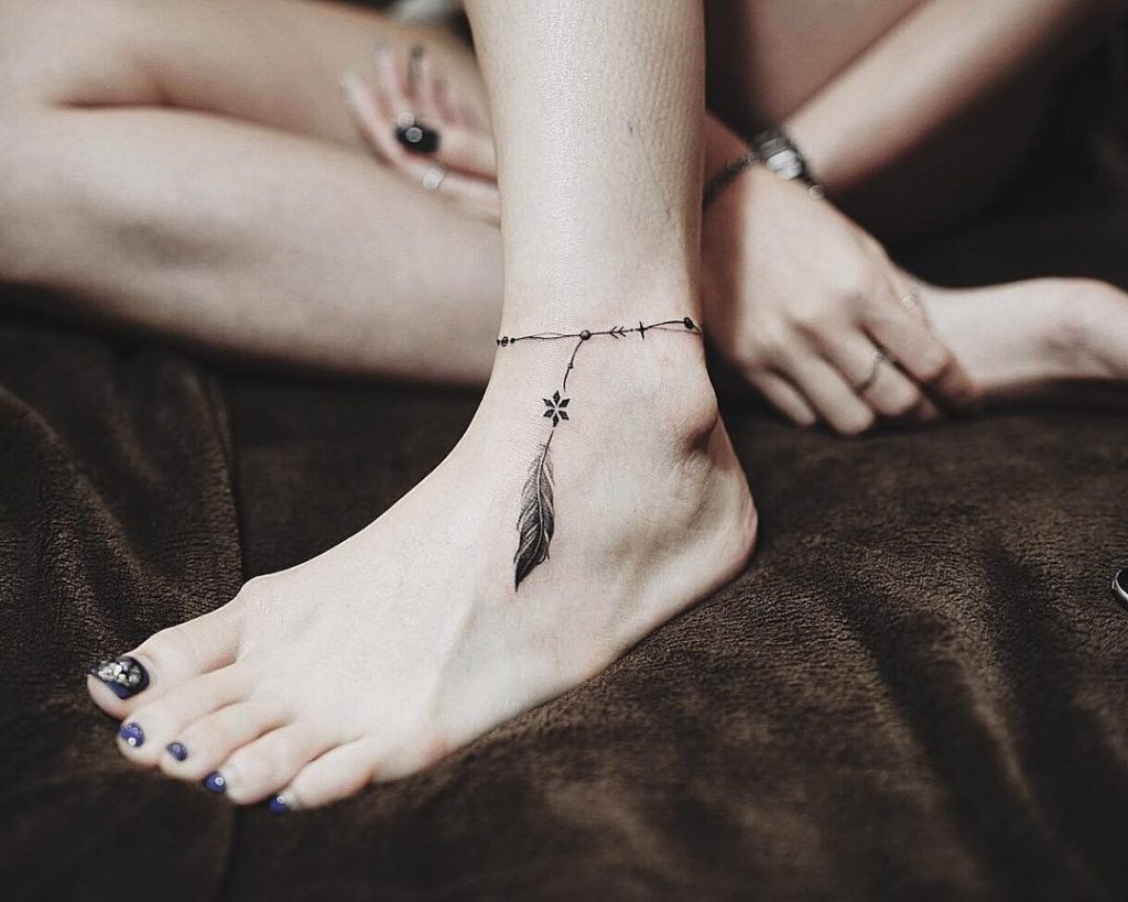 The most popular type of tattoo for a girl is a tattoo bracelet. This is a very beautiful and graceful type of tattoo that will emphasize your ankle well. Most often, such tattoos are made with feathers, beads, lace, bows and other attributes.