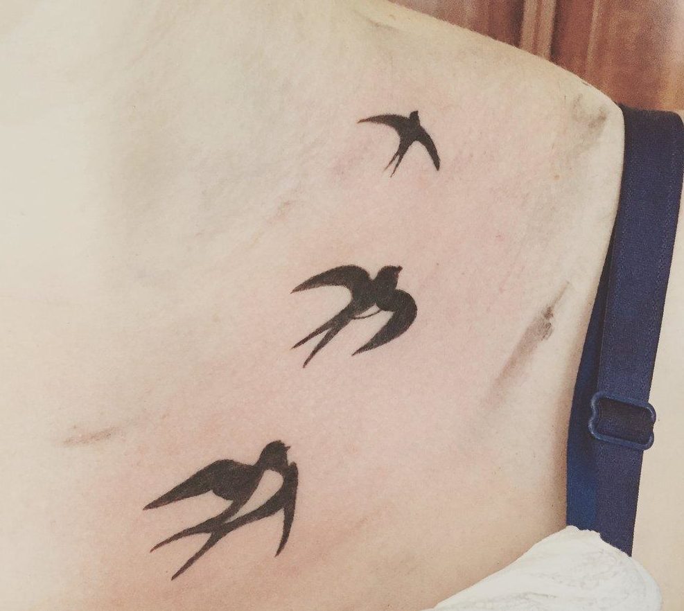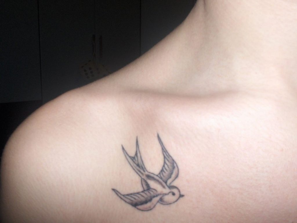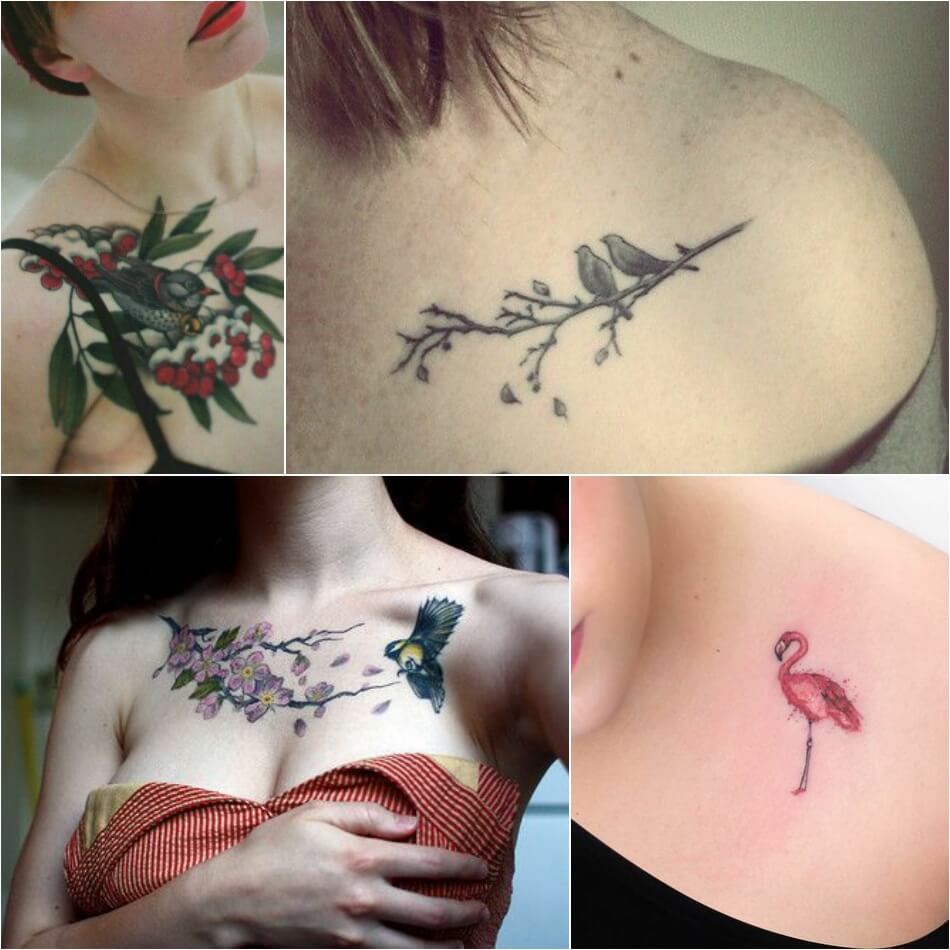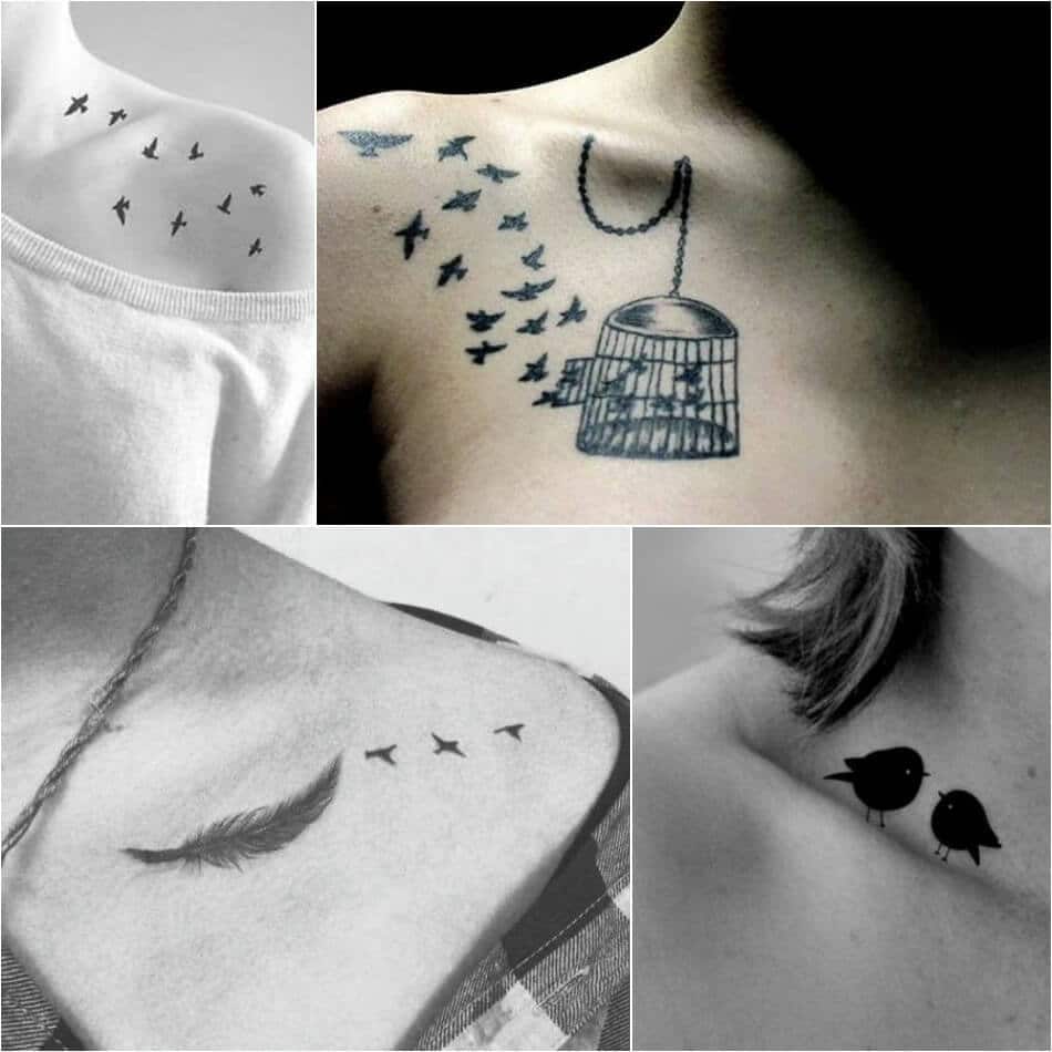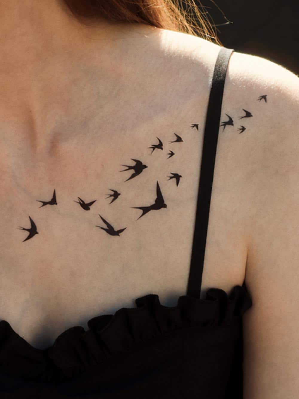 Most often, girls choose a tattoo of a swallow or other types of birds on their clavicle. Usually this is a flying flock, and maybe one individual. The tattoo master depicts birds of the same size or makes them different in size.