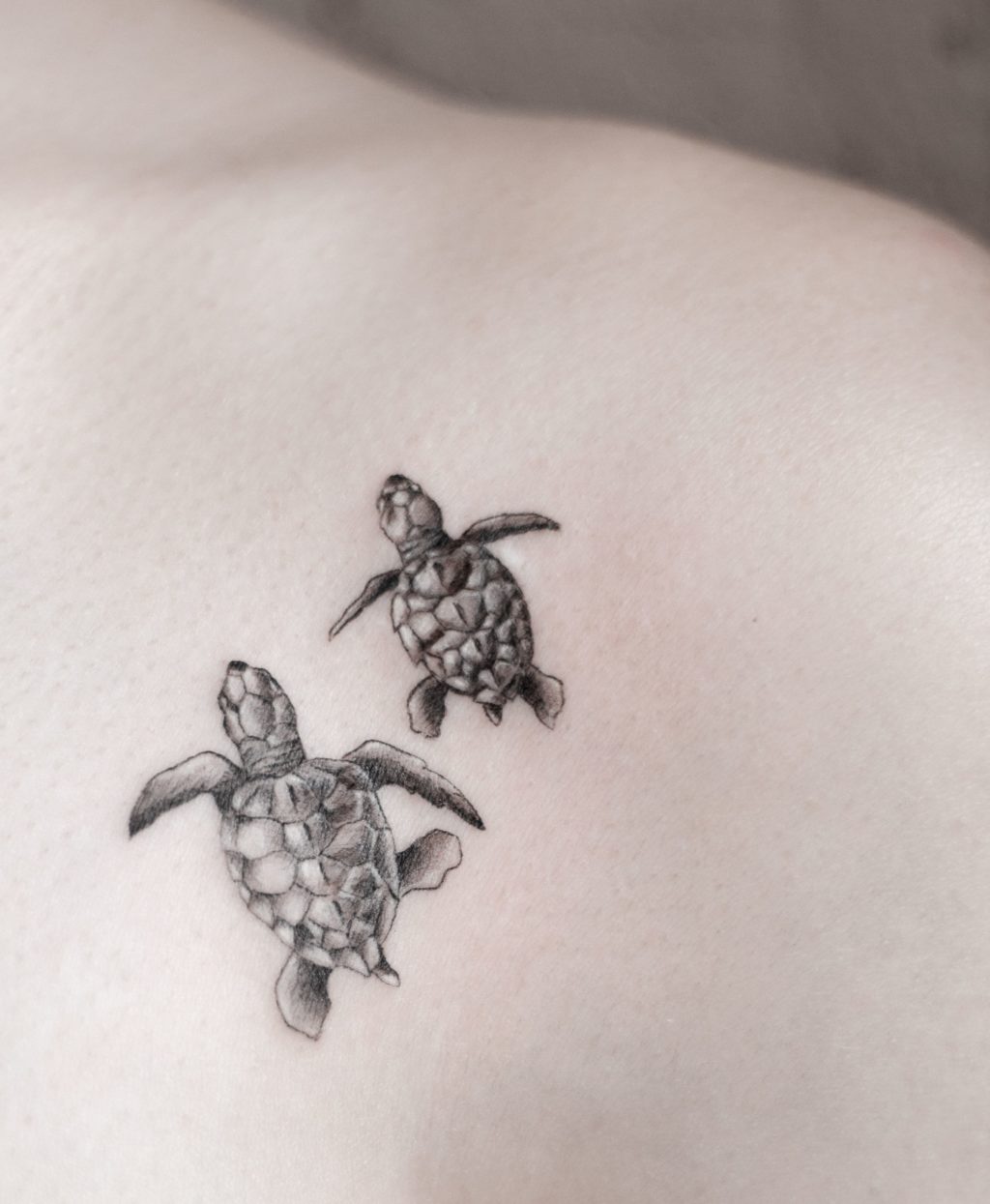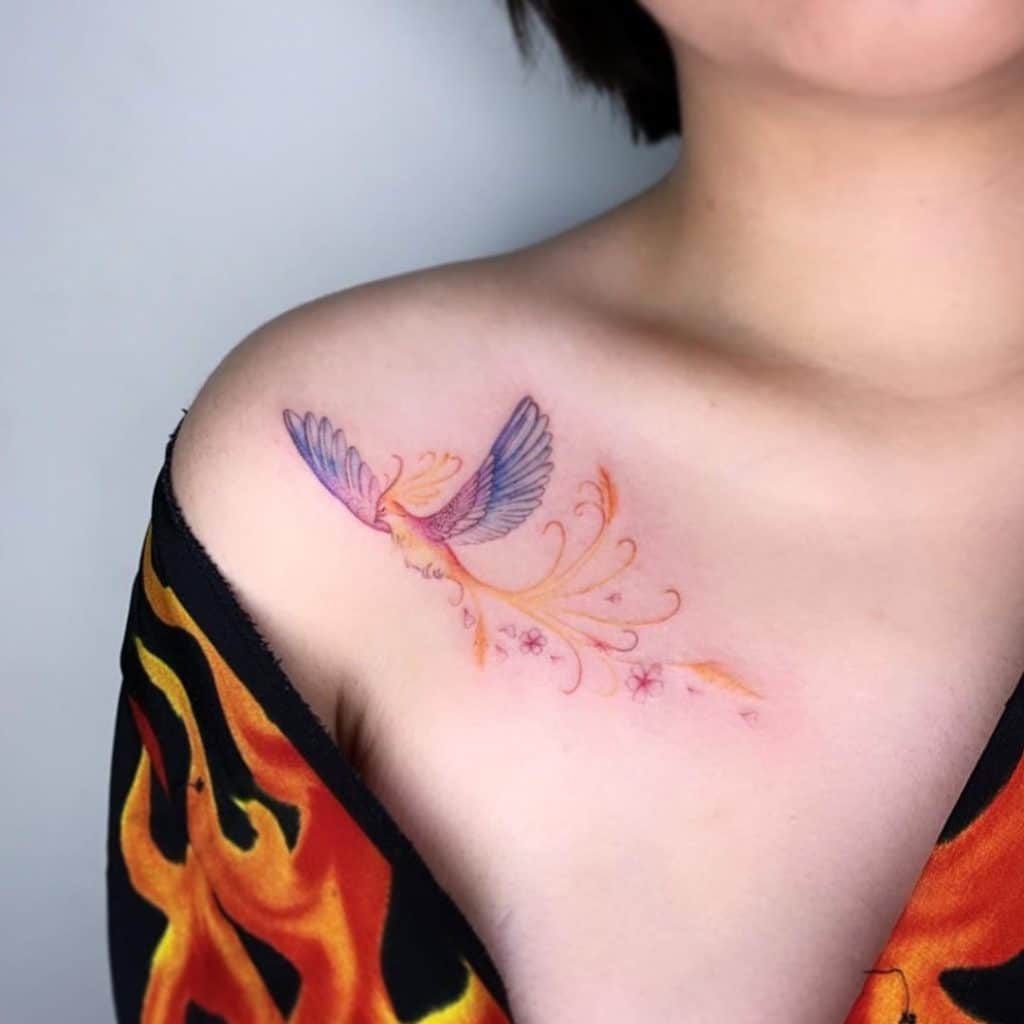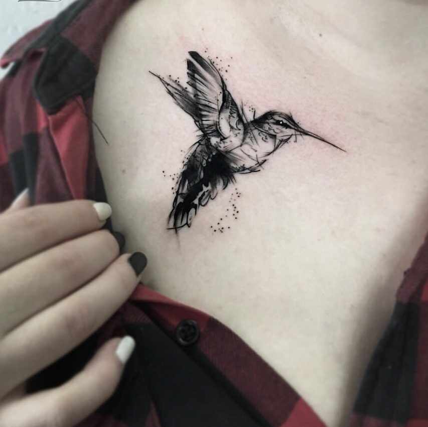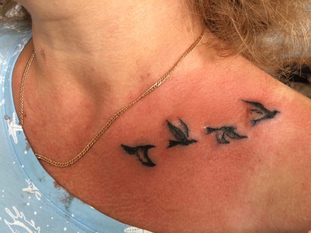 Most often, girls choose a tattoo of a swallow or other types of birds on their clavicle. Usually this is a flying flock, and maybe one individual. The tattoo master depicts birds of the same size or makes them different in size.