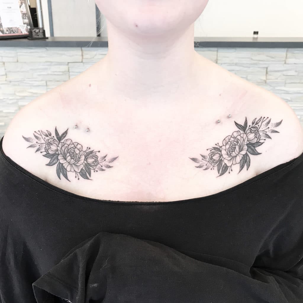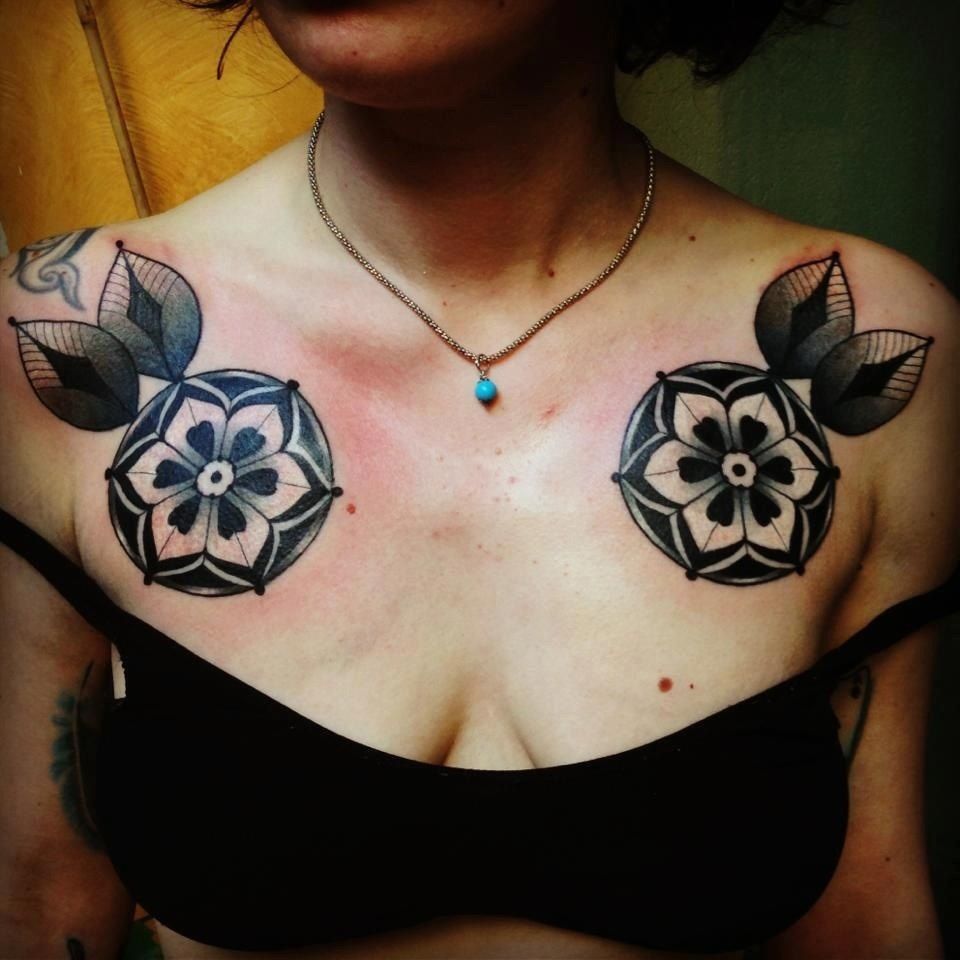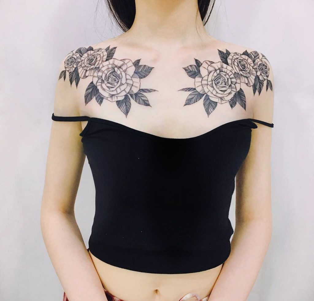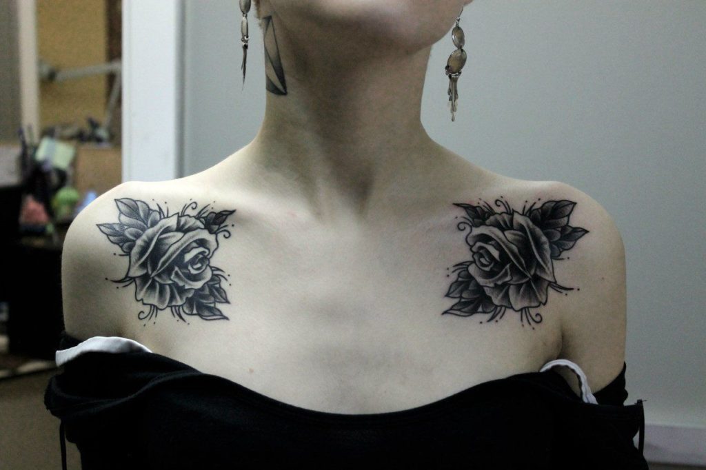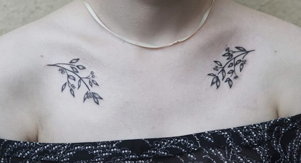 Such tattoos are performed immediately on two collarbones and usually have a mirror image of each other. Basically they are performed in black and white, and the size already depends on your desire.