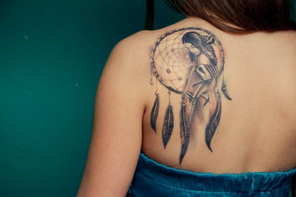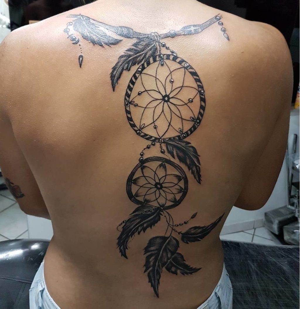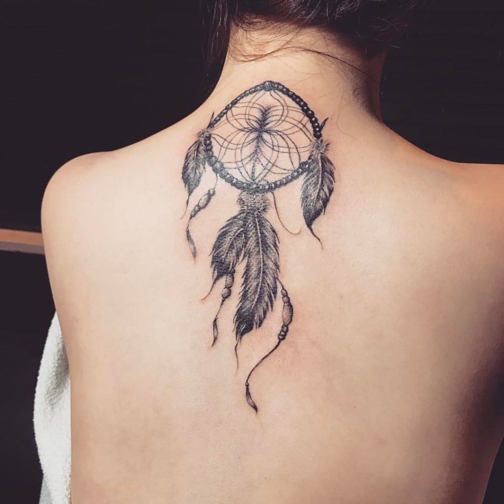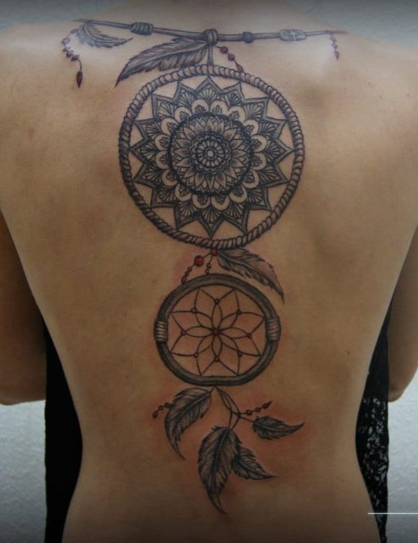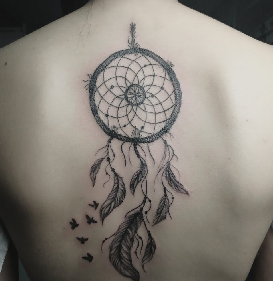 The dream catcher symbol will look very original on your back. This is a beautiful pattern, with additional elements in the form of feathers, animals, birds, as well as other details.