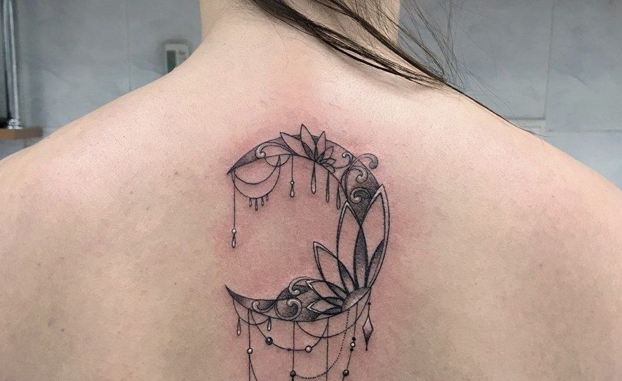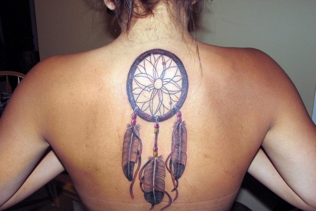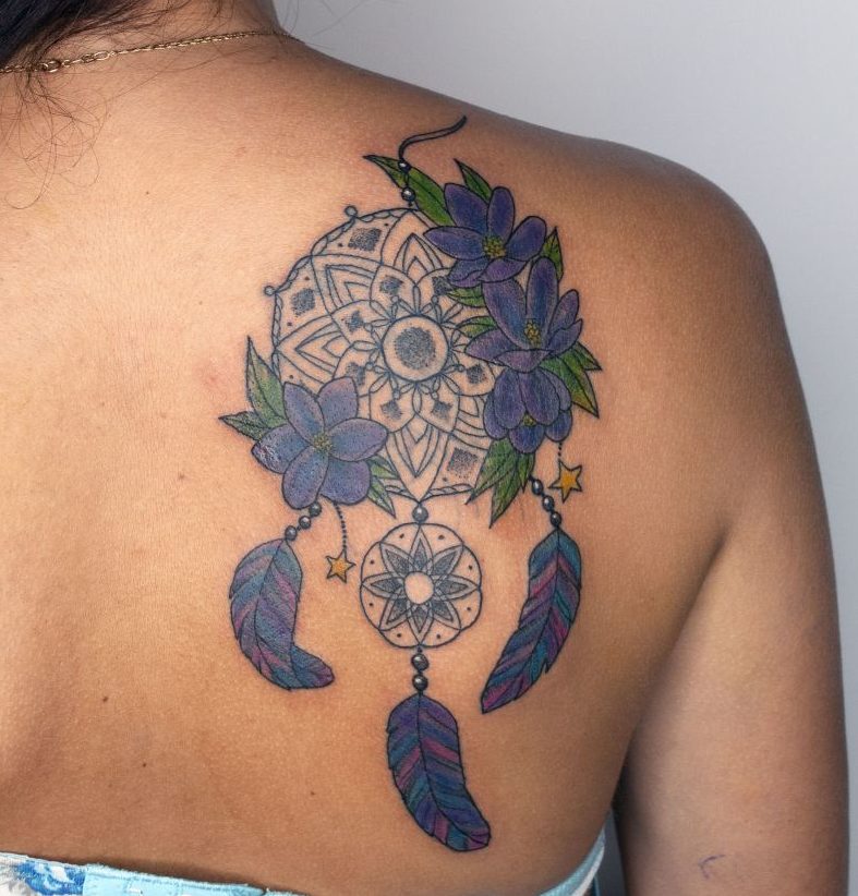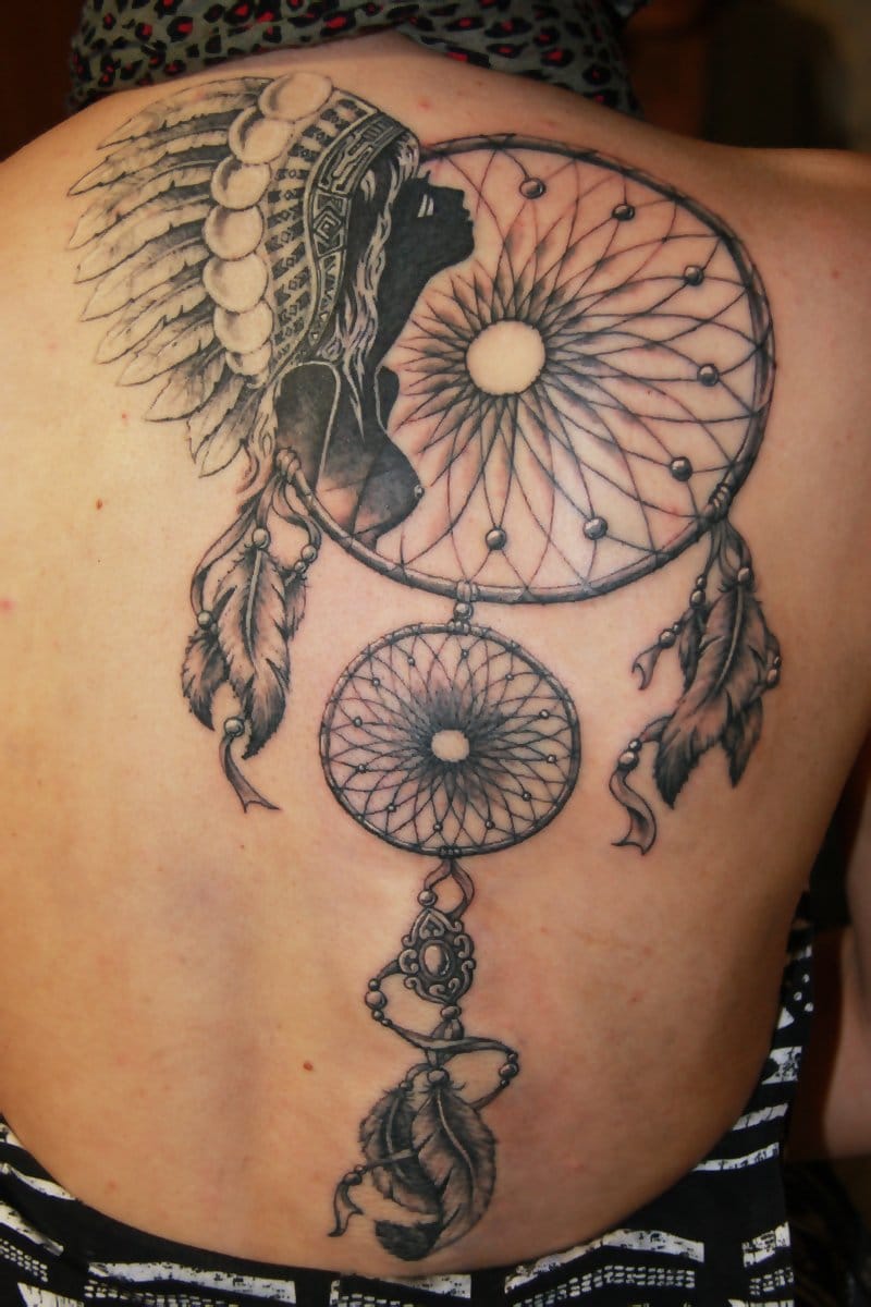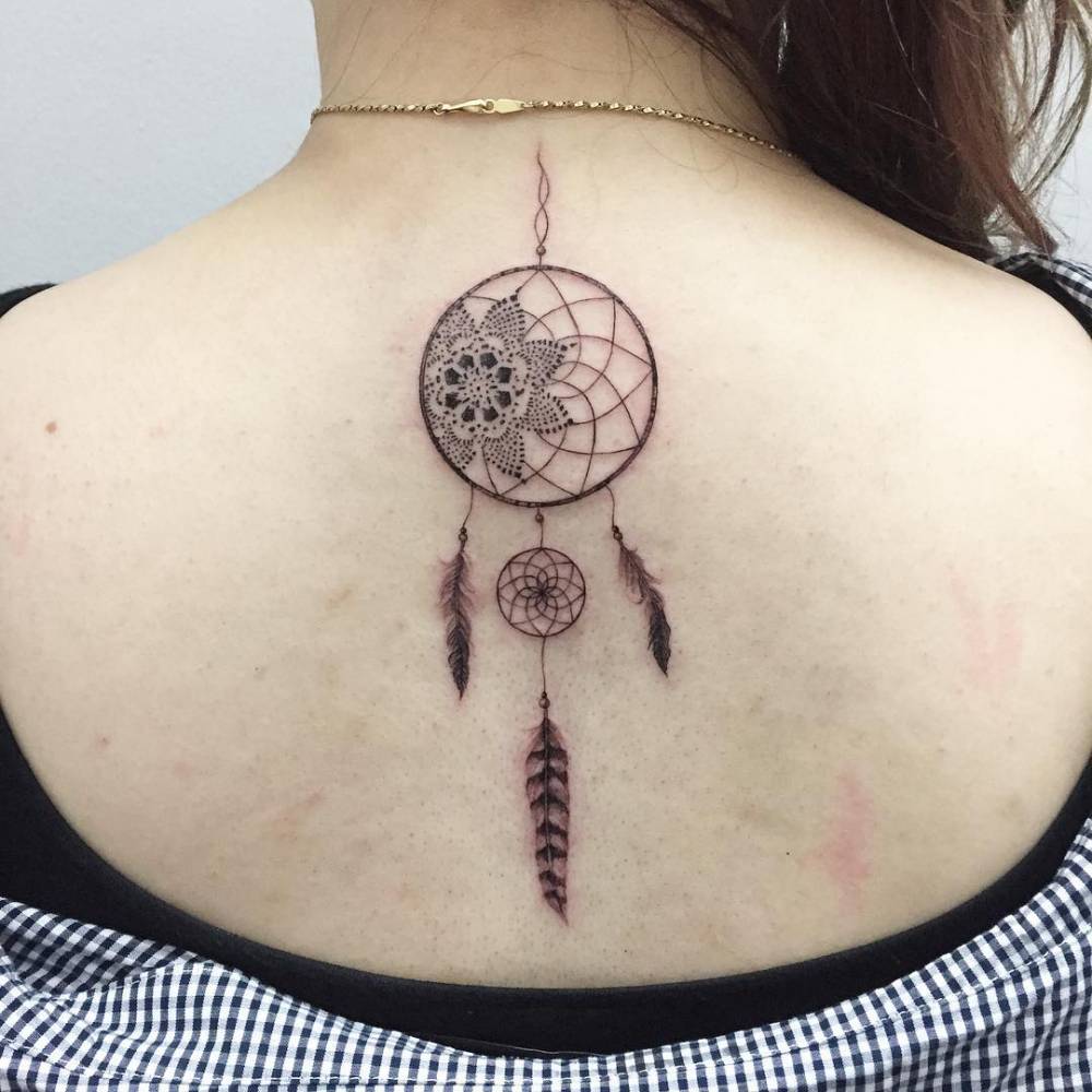 The dream catcher symbol will look very original on your back. This is a beautiful pattern, with additional elements in the form of feathers, animals, birds, as well as other details.