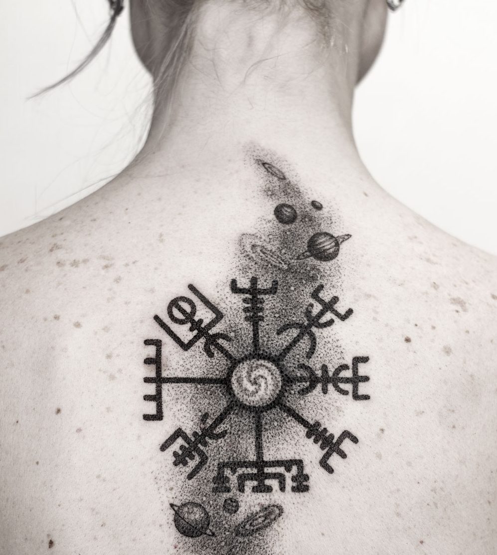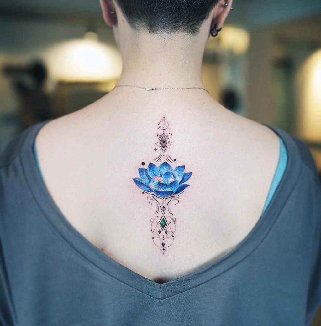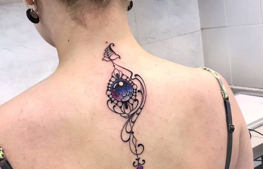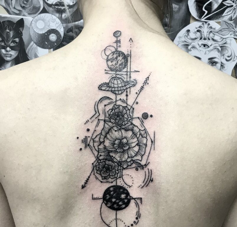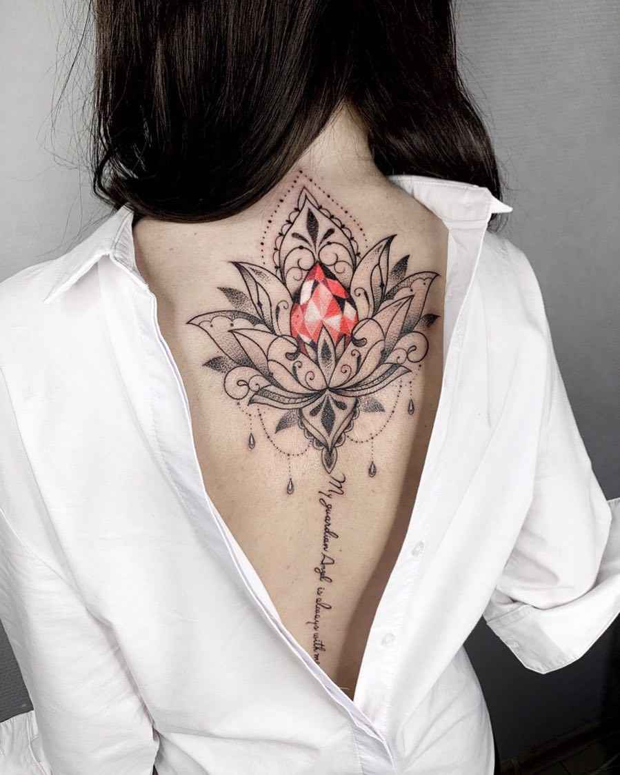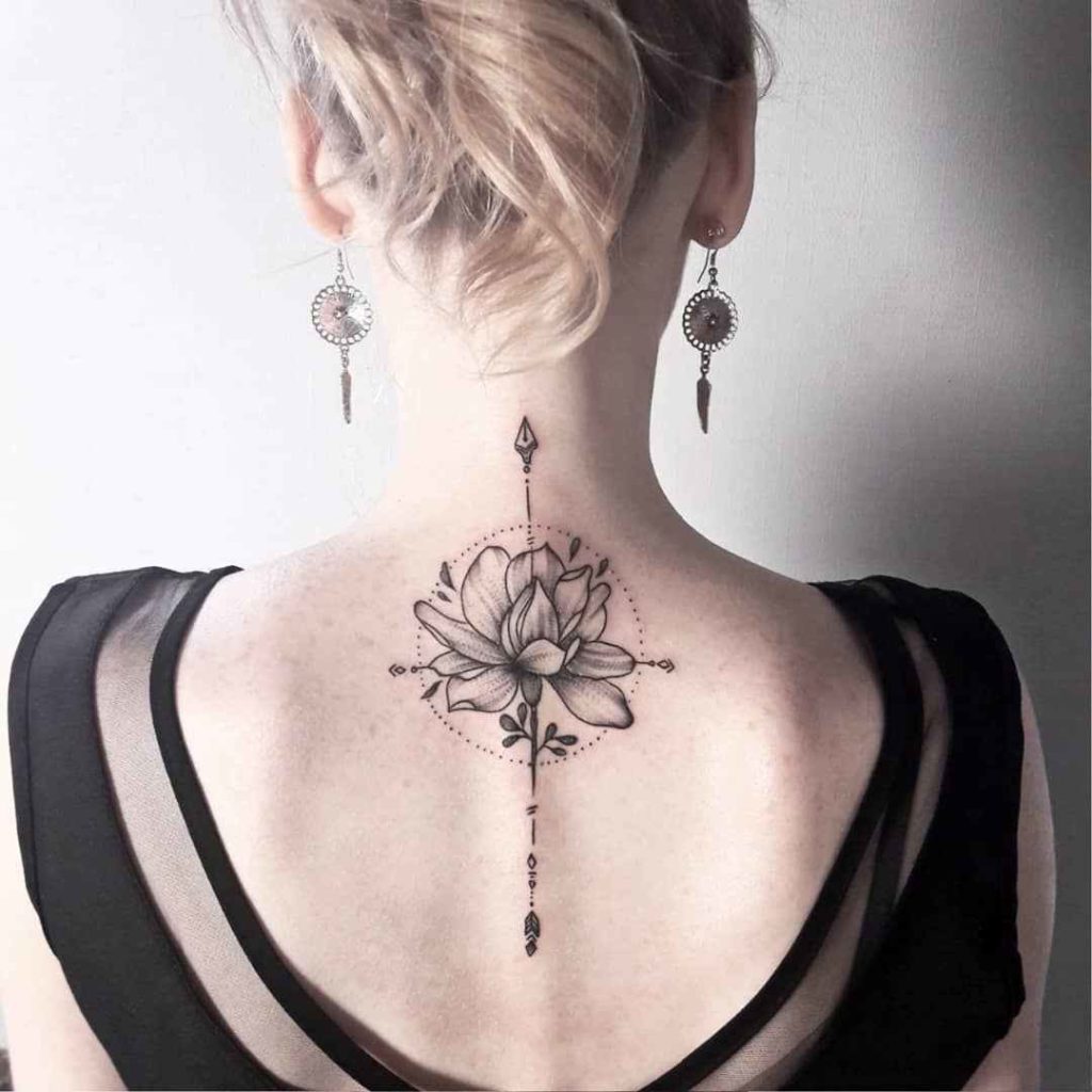 The peculiarity of the tattoo on the back is that here you are free to choose a specific place yourself. That is, in one embodiment, the tattoo may be located on your neck. It can be very small, or vice versa, like the tip of an iceberg, expand downward.