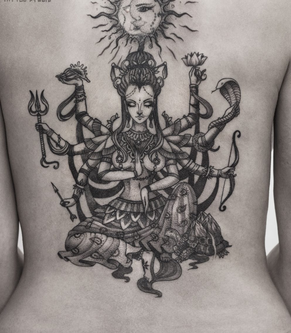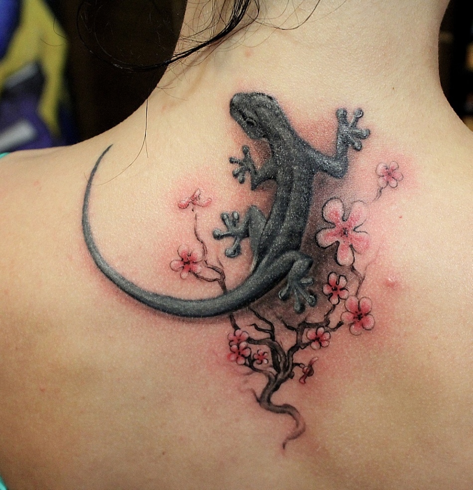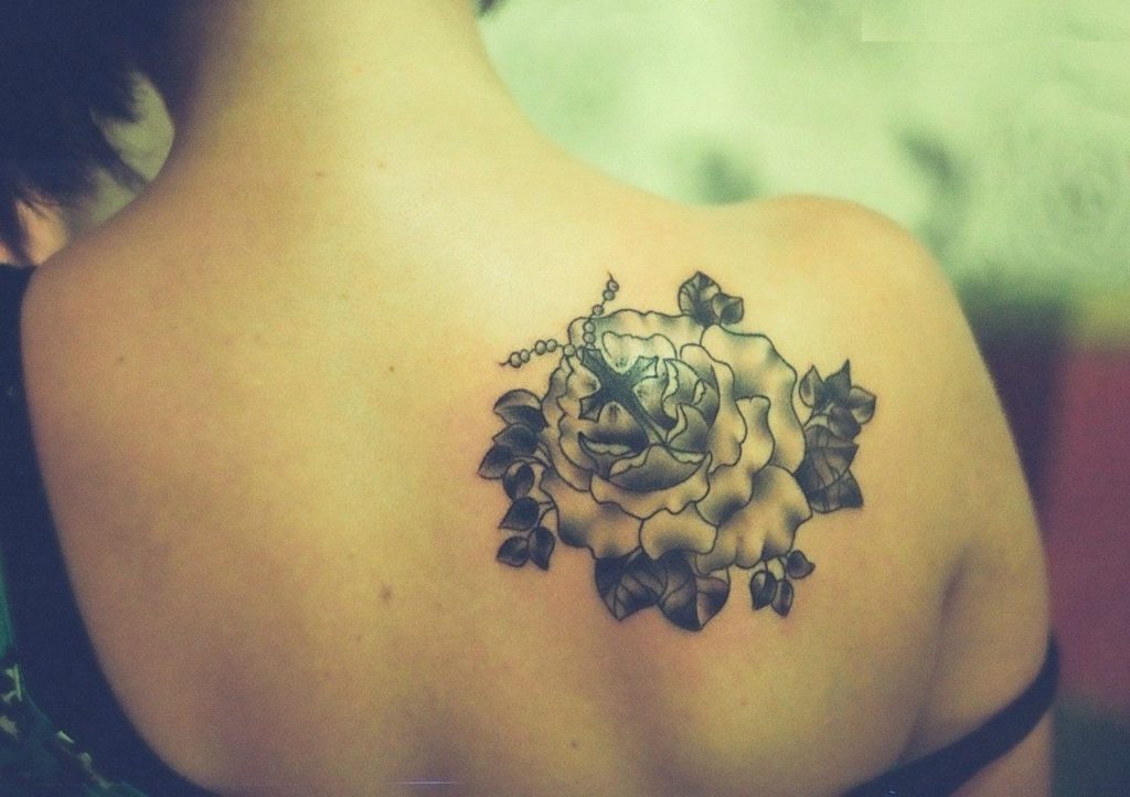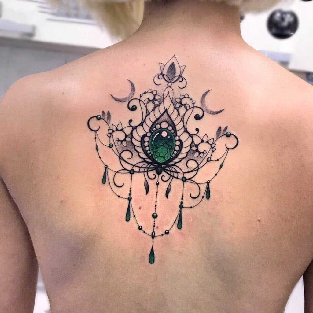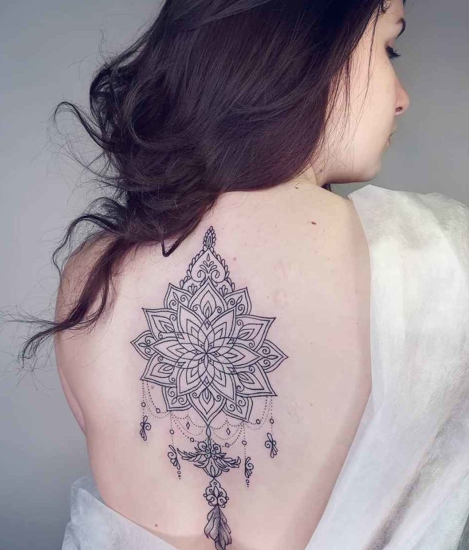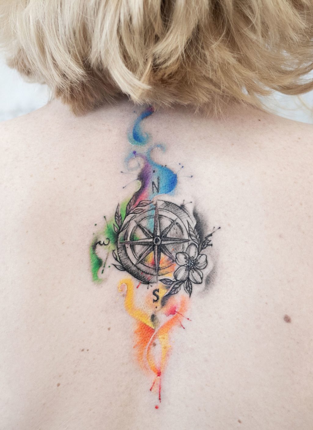 The peculiarity of the tattoo on the back is that here you are free to choose a specific place yourself. That is, in one embodiment, the tattoo may be located on your neck. It can be very small, or vice versa, like the tip of an iceberg, expand downward.