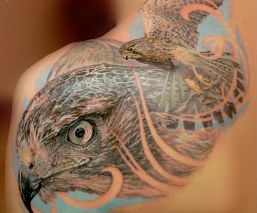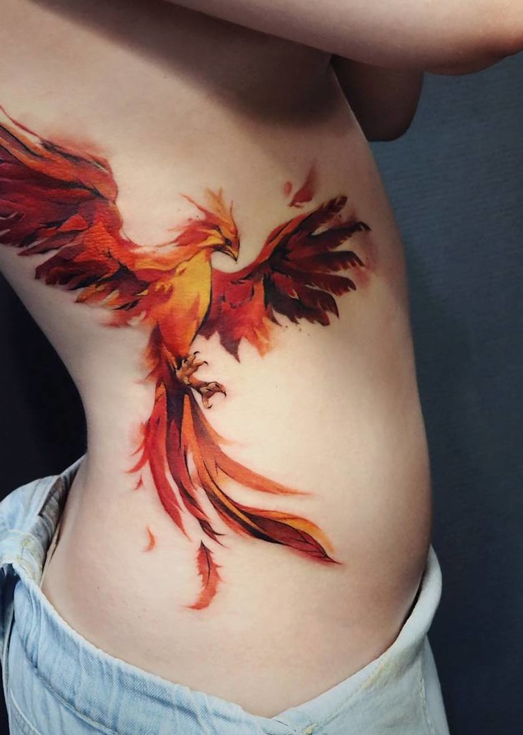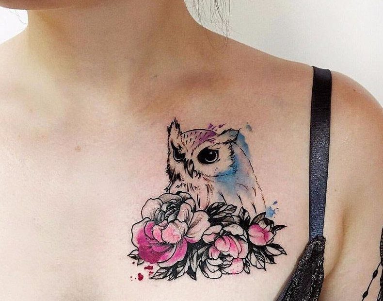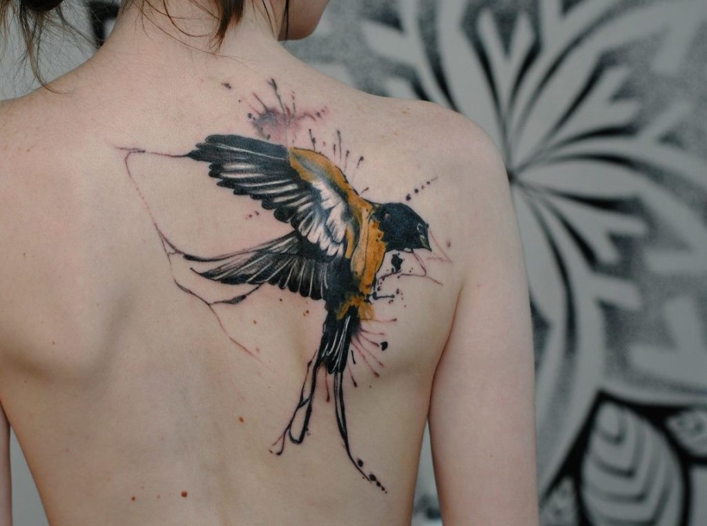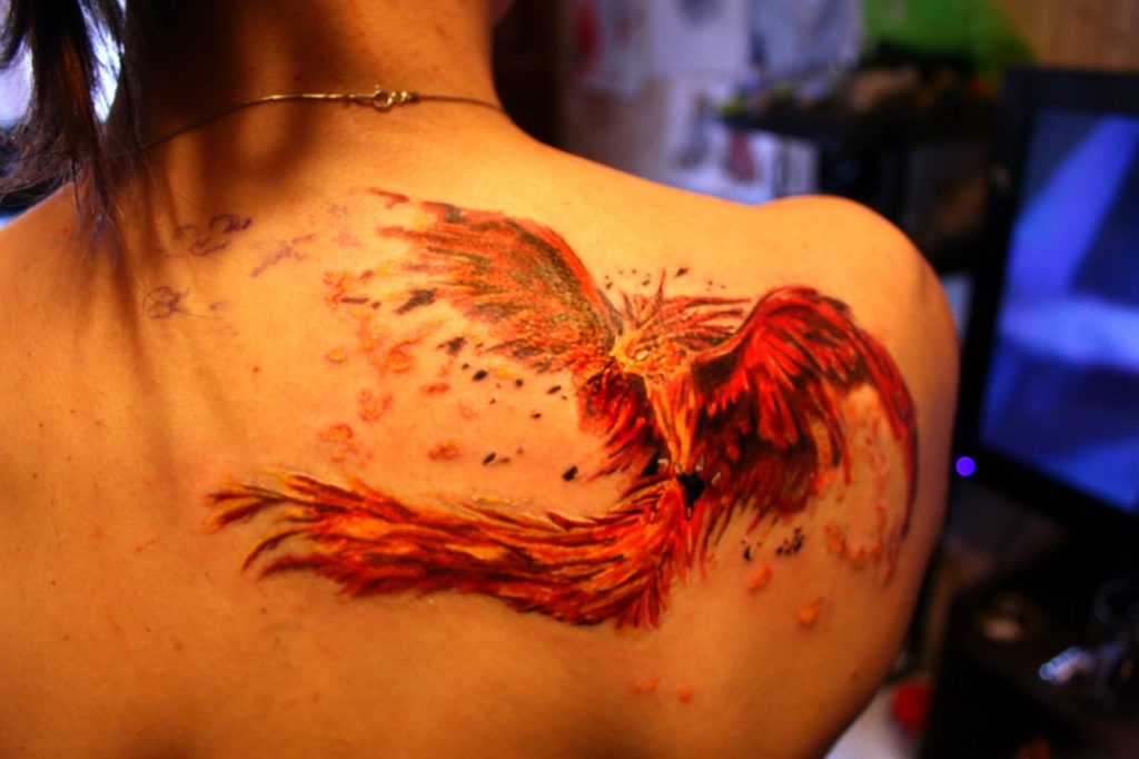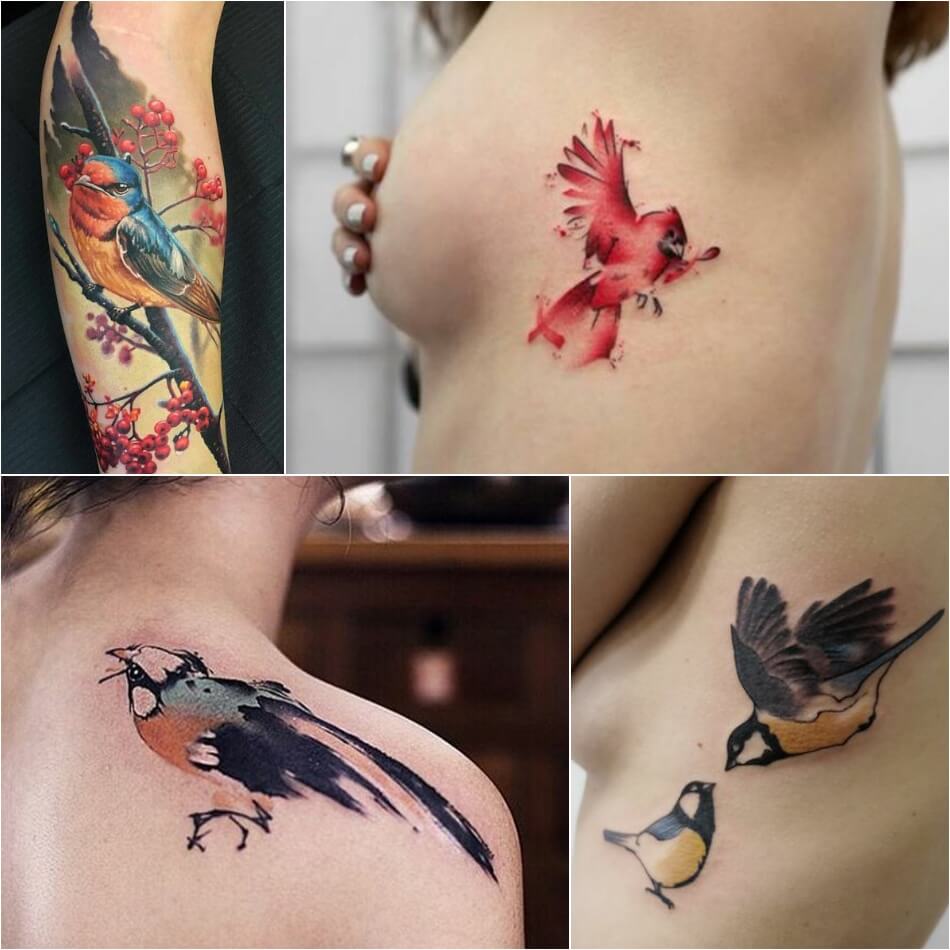 Large bird tattoos with spread wings will look very impressive on girls. You can also choose a bright Firebird, swallows, owls, or other birds.