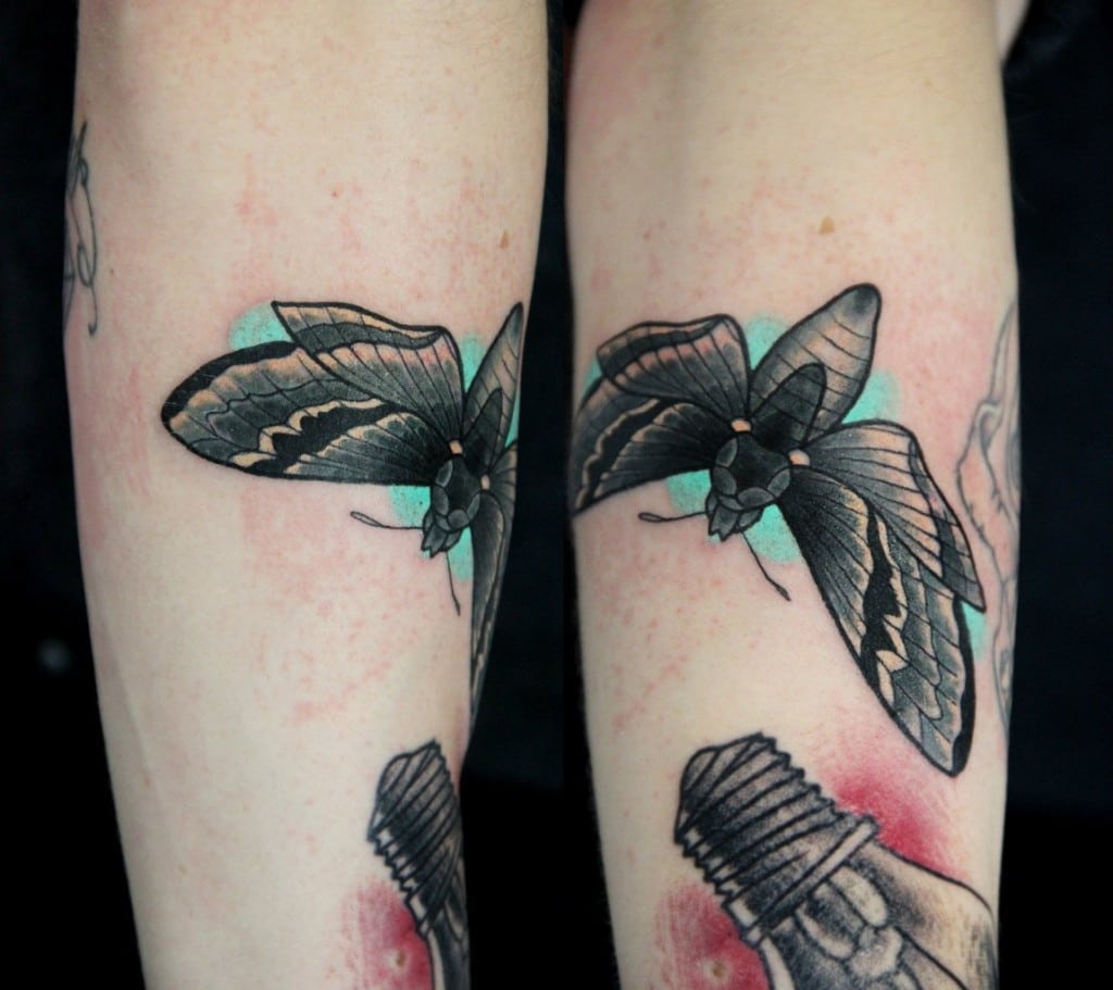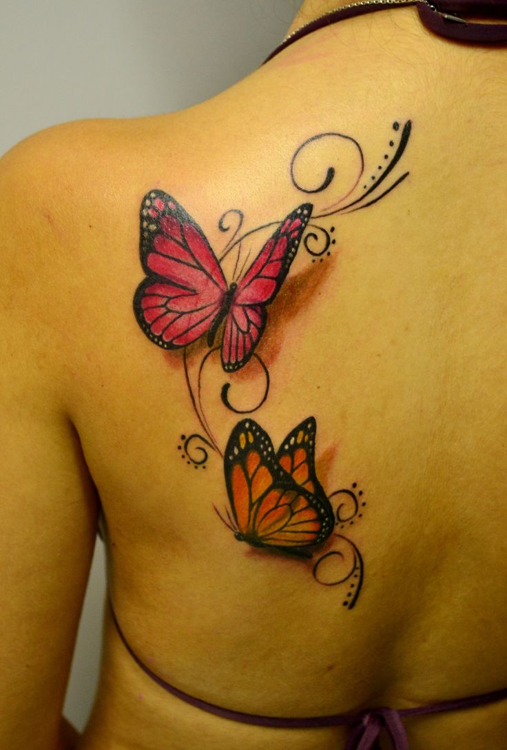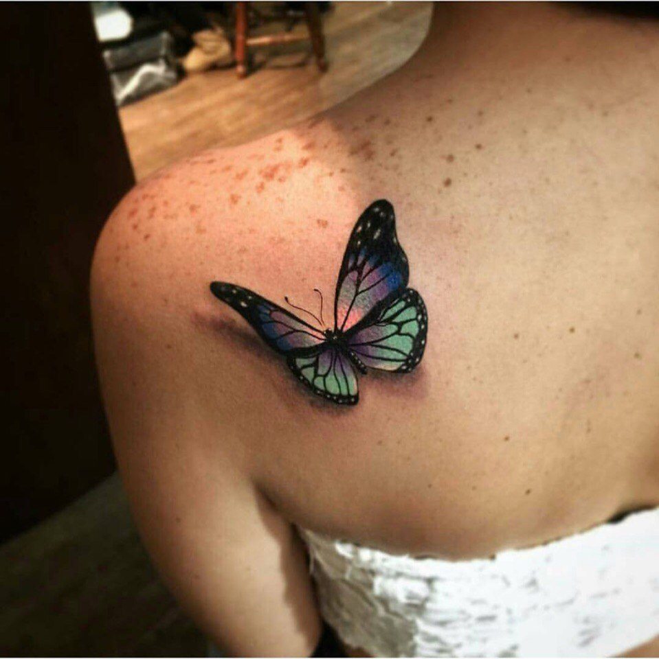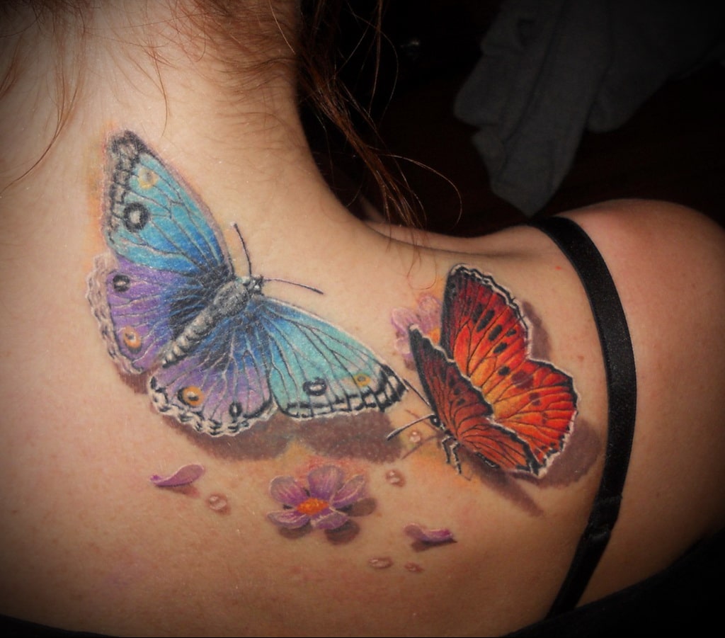The most popular color tattoos are butterflies. They are cute, tender, colorful. In the color version, such butterflies are made so realistic that it seems they are now flying off your shoulder.