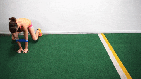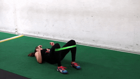 Lie on your back, bend your knees and put on an elastic band just below the knee. Then lift the pelvis, and do not tear off the feet from the floor. The exercise should be repeated 10 times in 3 sets.