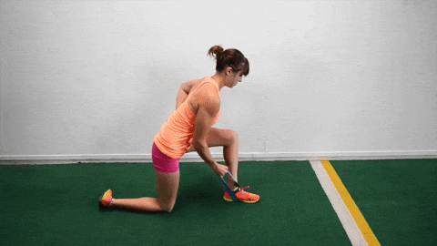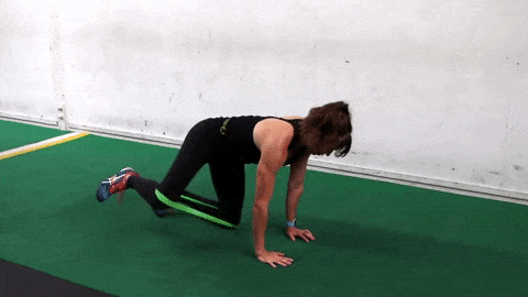 Begin the exercise from any leg. You need to kneel, and hook the elastic on the foot of the second leg, which you put in focus. After, with the opposite hand, begin to stretch the elastic, trying to make movements along the body. We repeat the exercise 10 times in three approaches, not forgetting to change arms and legs.