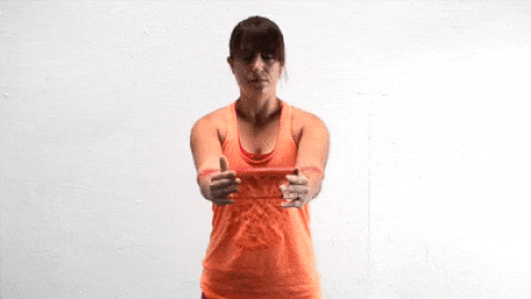 Gum should be put on hands in the elbows. Stand upright, straighten your back and spread your arms to the sides, while bringing the shoulder blades. We repeat the exercise 12 times in 3 sets.