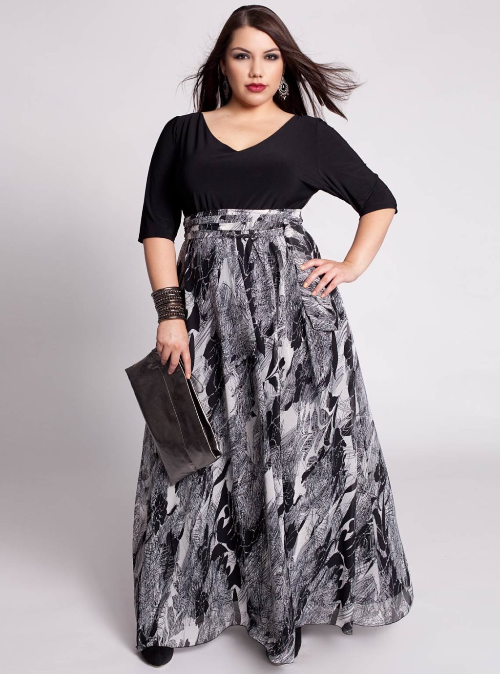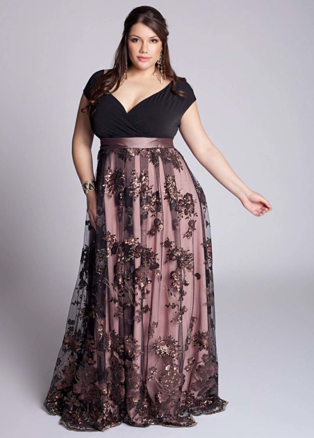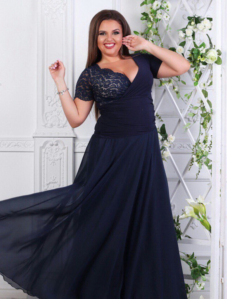 If you are planning a trip to a theater or a restaurant, then easily put on a long, evening dress. Such dresses can come with a smell and have a drapery. The tight-fitting top of the dress will emphasize and highlight the chest, and a looser bottom will hide the protruding tummy and full legs.