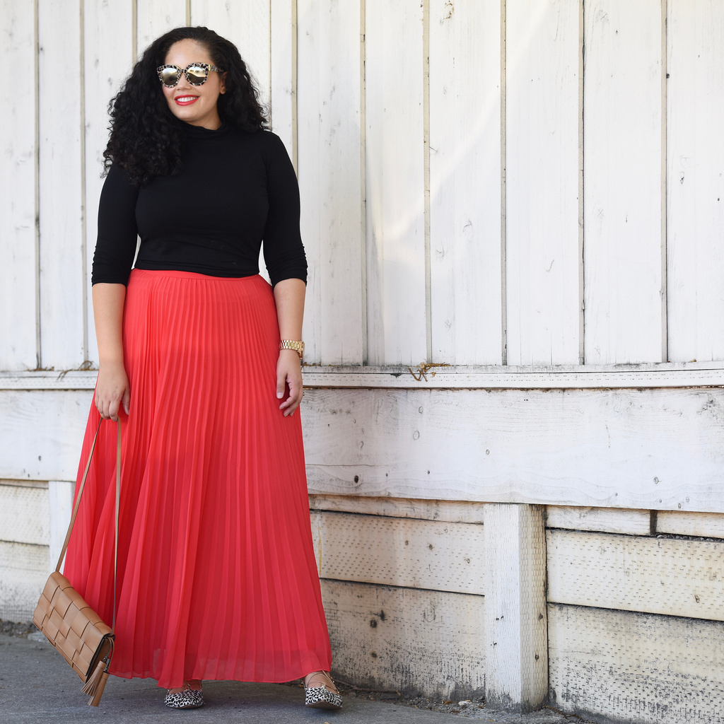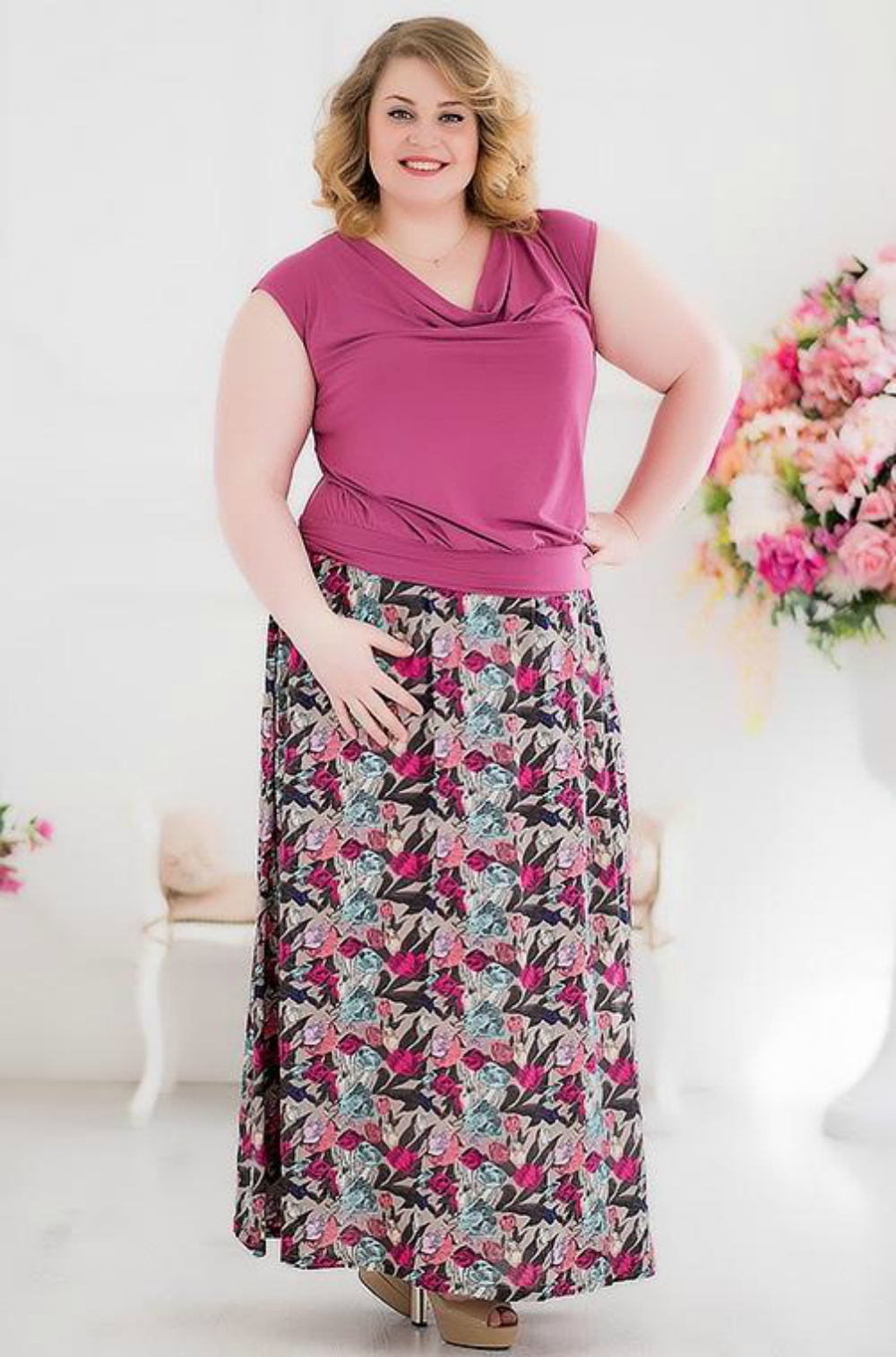 Long skirts will perfectly hide the problem part of the body. If you wear heels under such a skirt, then your height will visually stretch, and your figure will appear slimmer.
