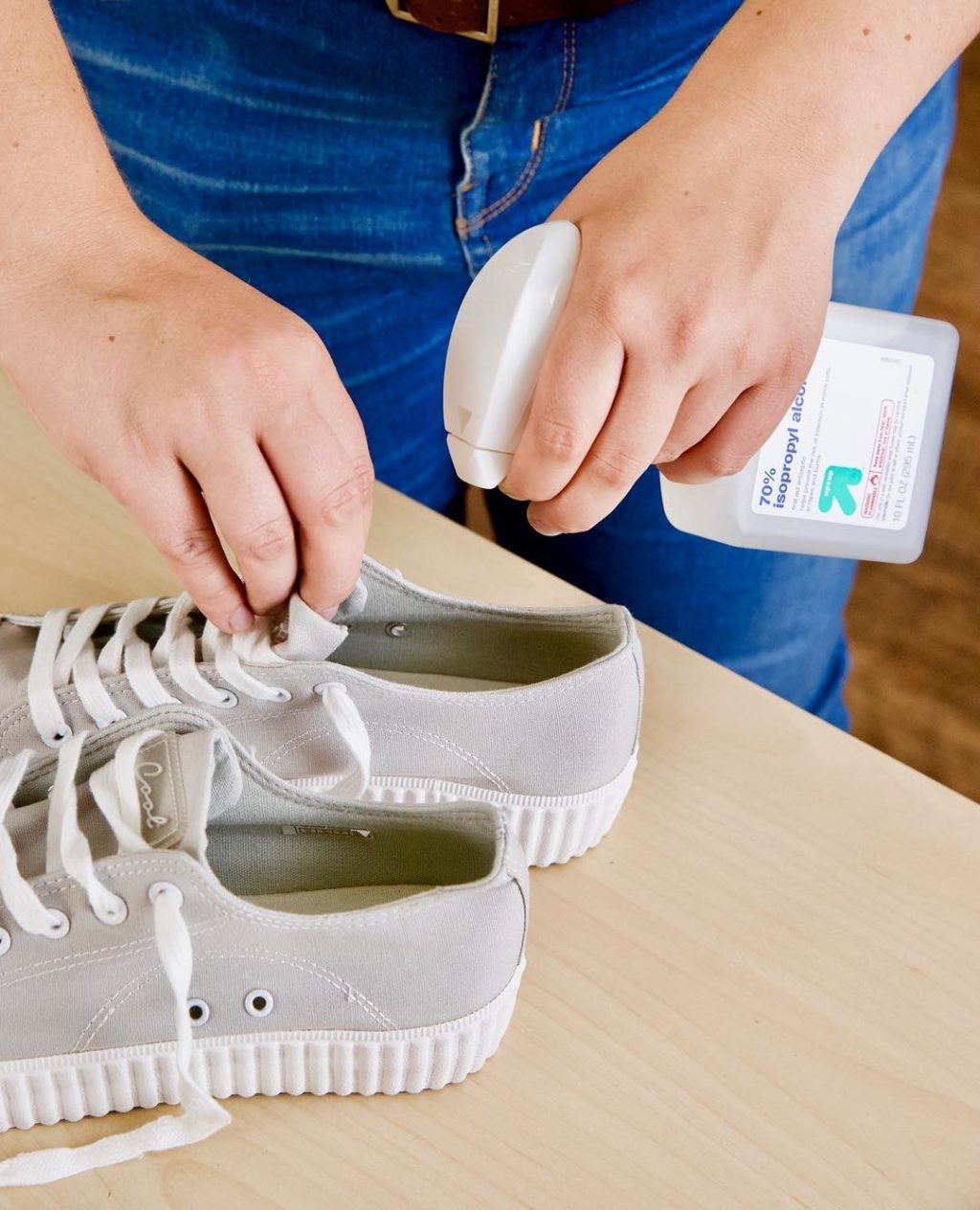 Pour alcohol into the sprinkler or wet a cloth in it and so process the inside of the shoe. After 2-3 hours, wipe the shoes with a dry cloth. And leave to dry in a warm place.