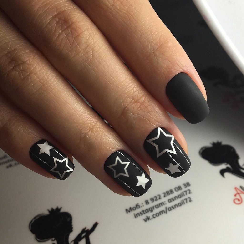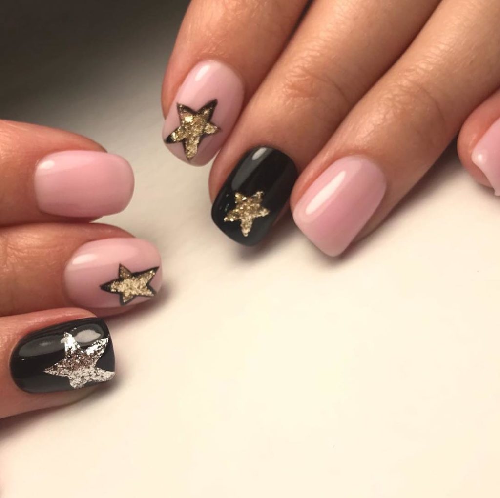 A manicure with stars looks very gentle and cute. Even if these stars are on a black lacquer basis. And so that there is no busting, perform stars not at all, but only on two or three nails.