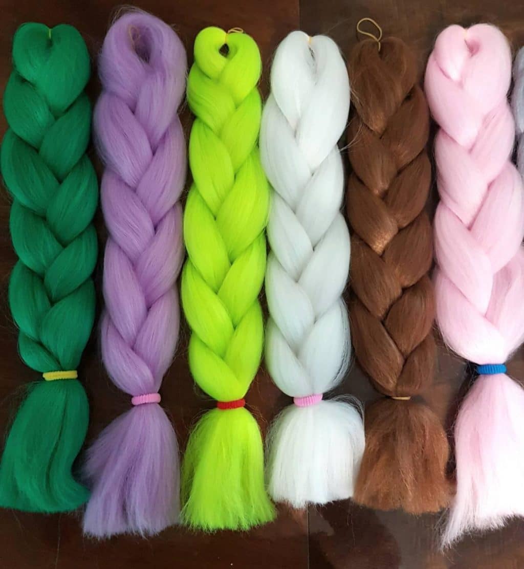 Kanekalon - Estos son hilos artificiales que tienen un color diferente. El color de Kanekalon varía desde tonos claros y ordinarios hasta colores de ácido cáustico.