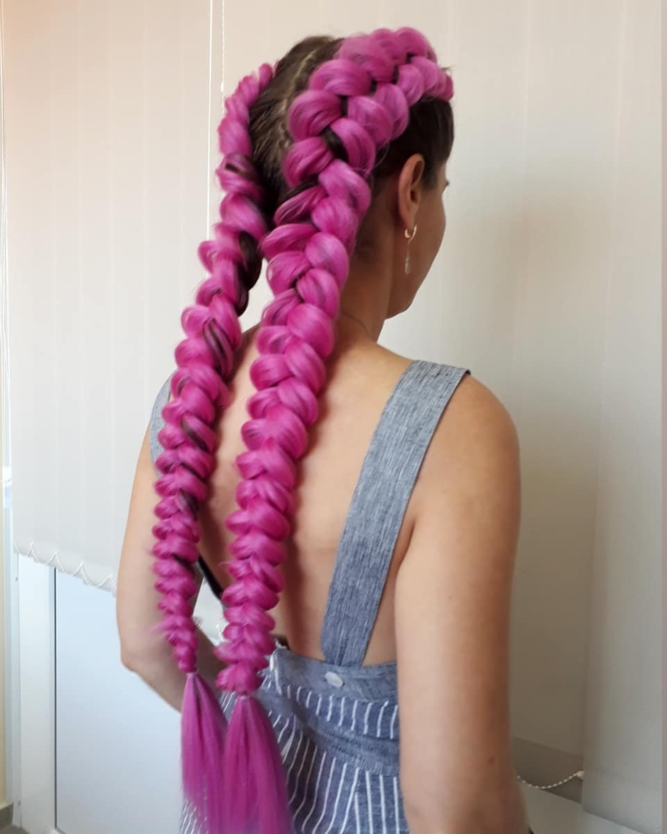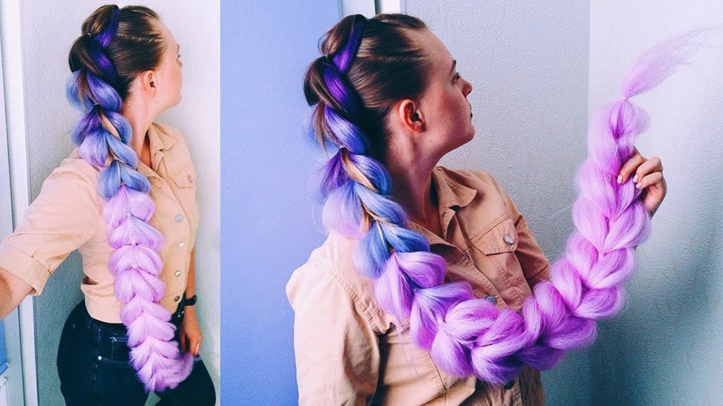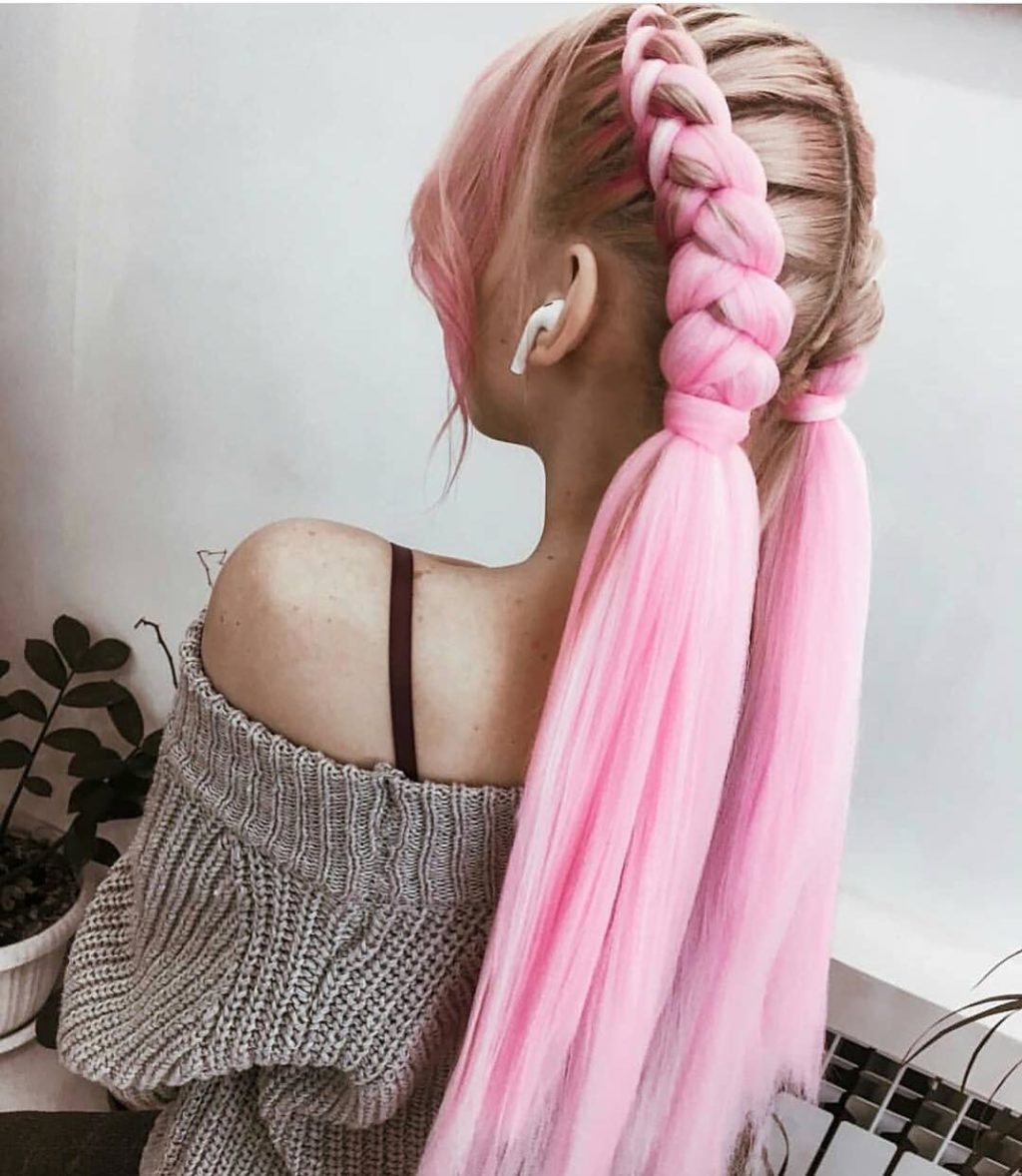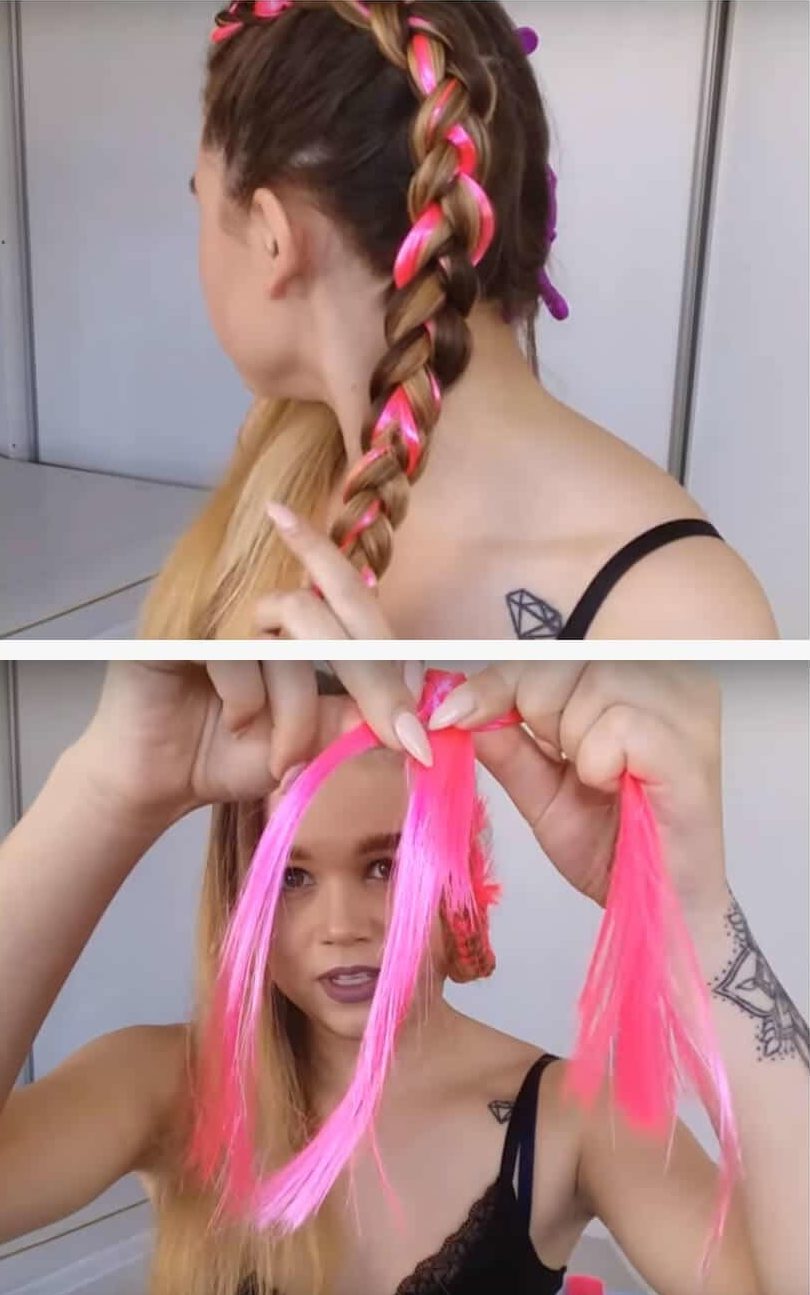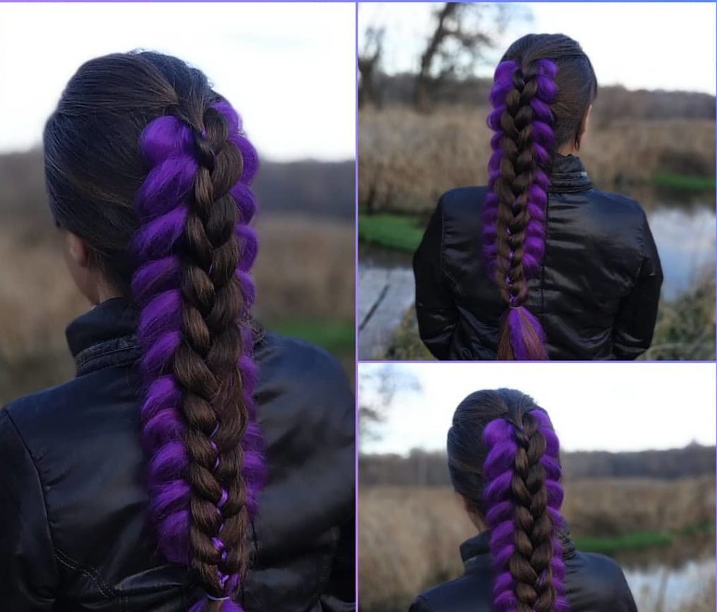 - Sujete la coleta con una banda elástica. Por cierto, puedes usar varios colores de Kanekalon, simplemente alterándolos.