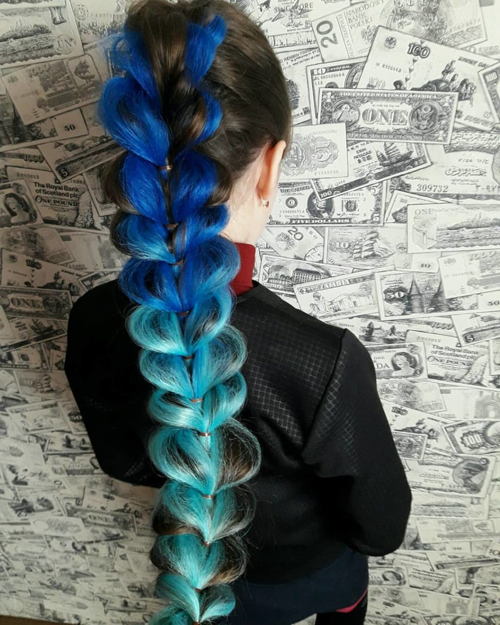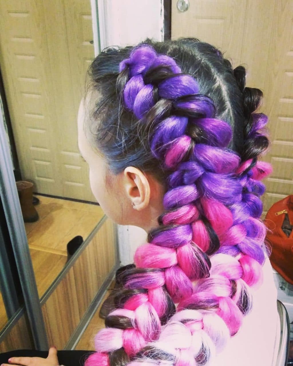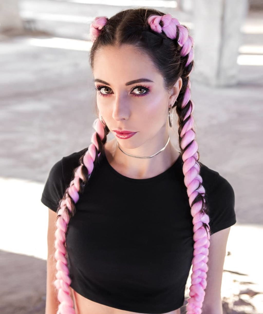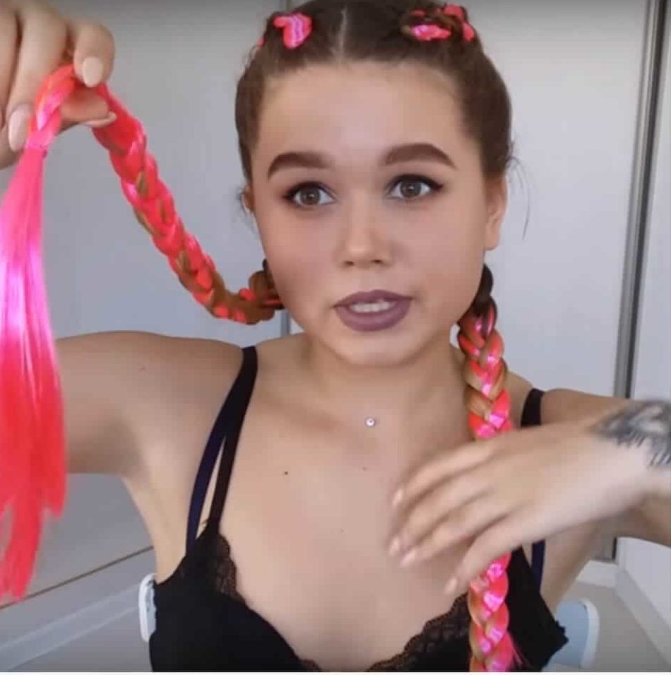 - Sujete la coleta con una banda elástica. Por cierto, puedes usar varios colores de Kanekalon, simplemente alterándolos.