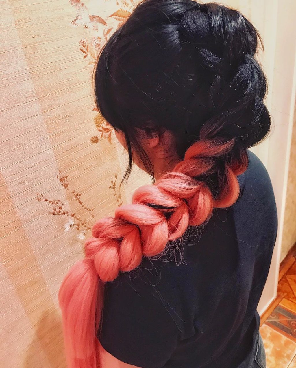 - Continuamos tejiendo la trenza por el contrario, tejiendo el mismo método que arriba del kanekalon. Cuando llegues a la parte posterior de la cabeza, debes tomar otra parte del kanekalon y tejerlo exactamente de la misma manera que la primera parte. Si la longitud es demasiado larga, se puede cortar la punta del Kanekalon.