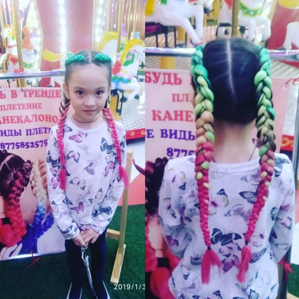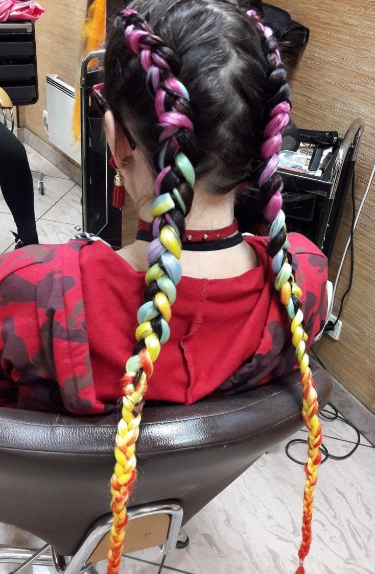 Un kanekalon multicolor tiene hasta siete colores en una hebra. Esto puede ser una combinación de todos los colores del arco iris o simplemente una mezcolanza de flores que difieren entre sí en uno, dos tonos.