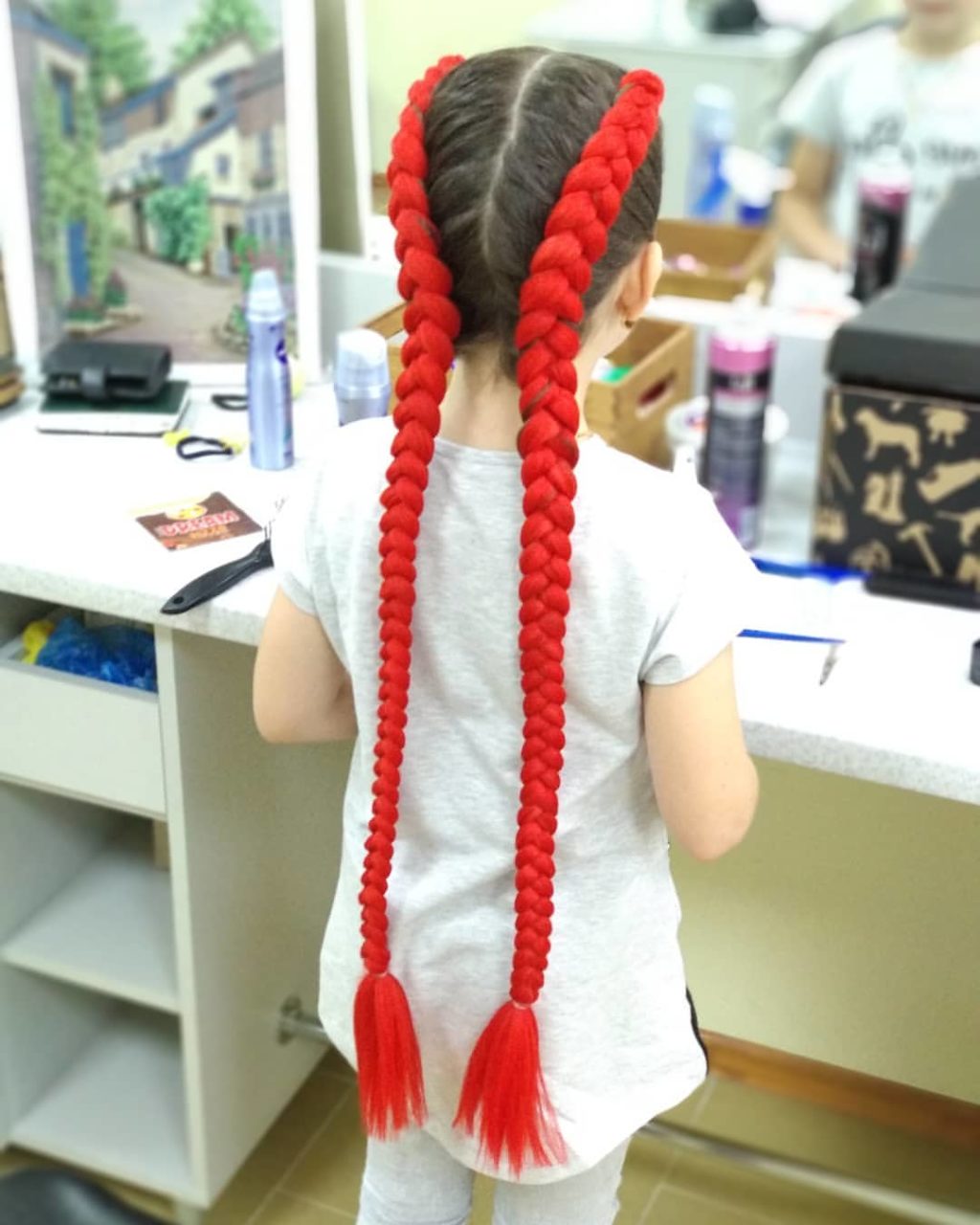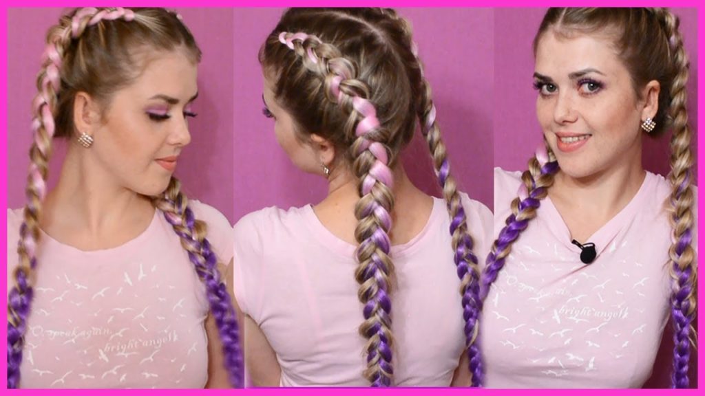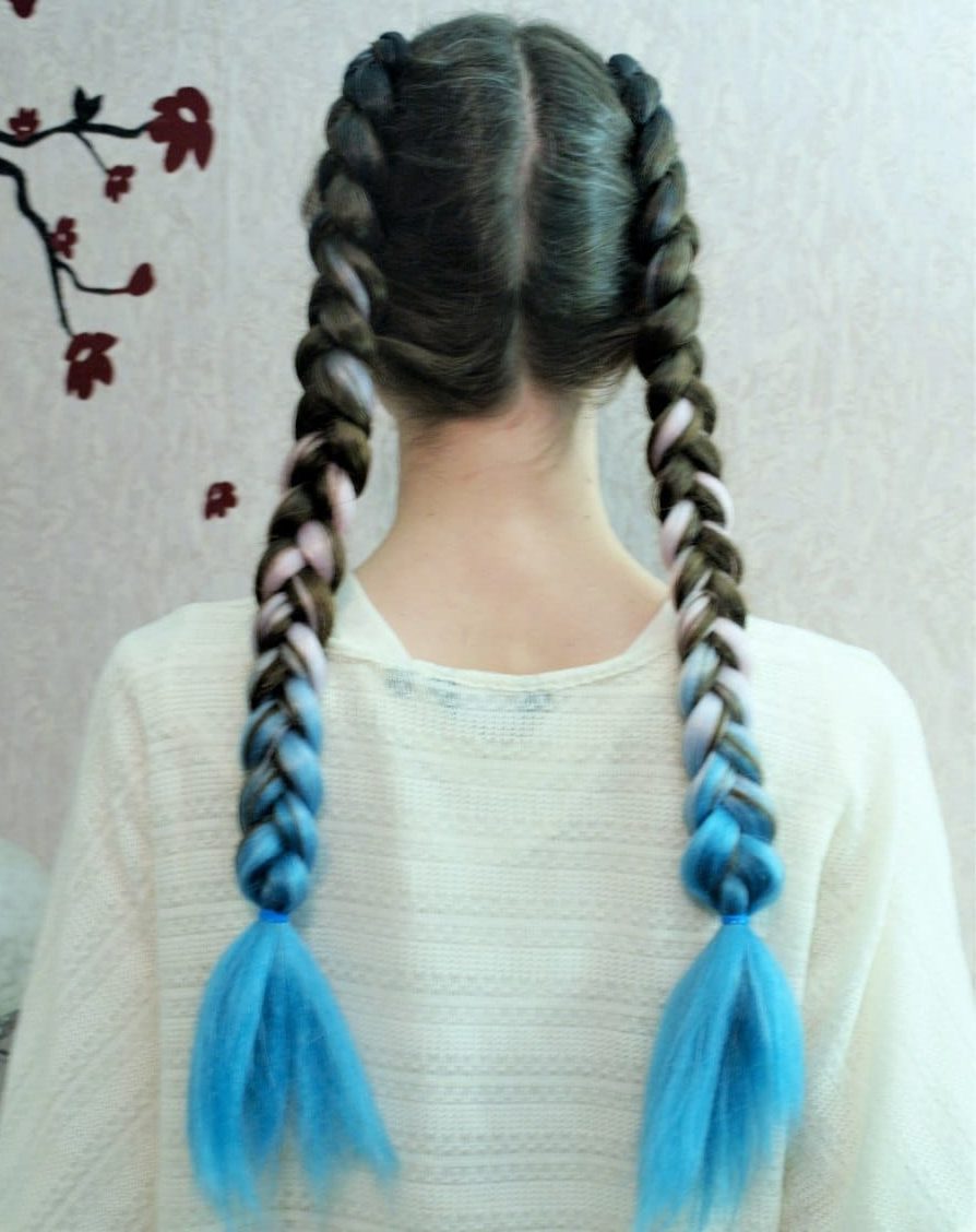 - Hacemos lo mismo con la segunda trenza, y arreglamos los extremos de las trenzas con bandas elásticas. Para soldar bellamente los bordes cortados del kanekalon, si corresponde, debe bajar su punta al agua hirviendo.