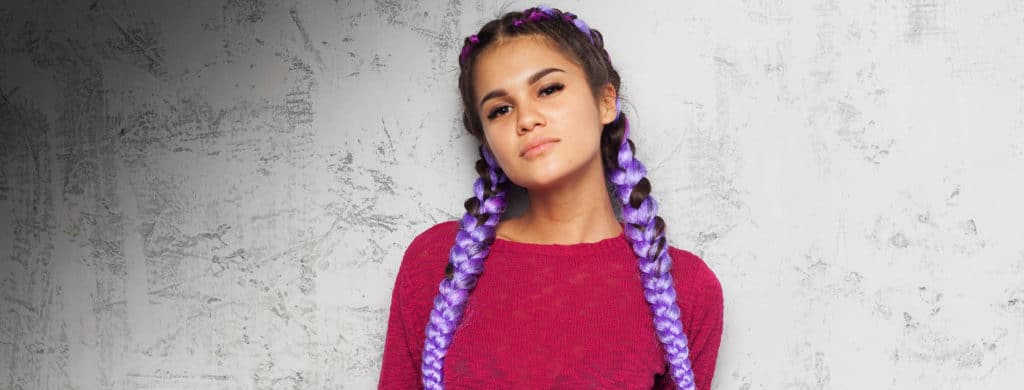 - Haga aproximadamente cuatro tejidos de esta manera, y luego agregue una segunda pieza de Kanekalon a la trenza.Después de unos pocos tejidos, todo depende de la longitud de tu cabello, agrega la tercera pieza de kanekalon a la trenza y trenza la trenza hasta el final.
