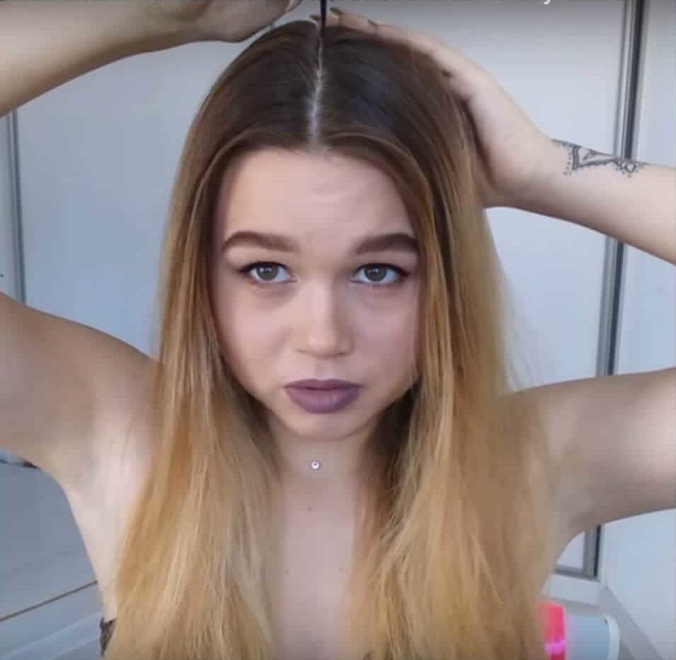 - Todo el cabello debe dividirse en dos partes con una separación vertical. Berm es un poco de nuestro kanekalon, como se muestra en la foto, y lo arreglamos para la viuda y lo enhebramos a través de la cerradura, fijándolo con invisibilidad.