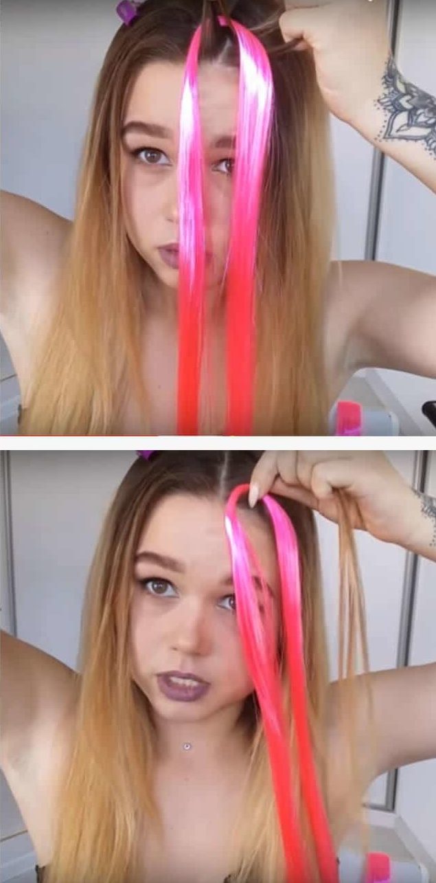 - Luego agregue kanekalon a la hebra central. Puedes envolverlo alrededor de tu cabello o atar la punta con goma de silicona.