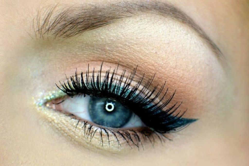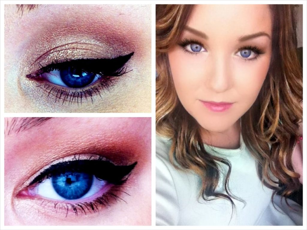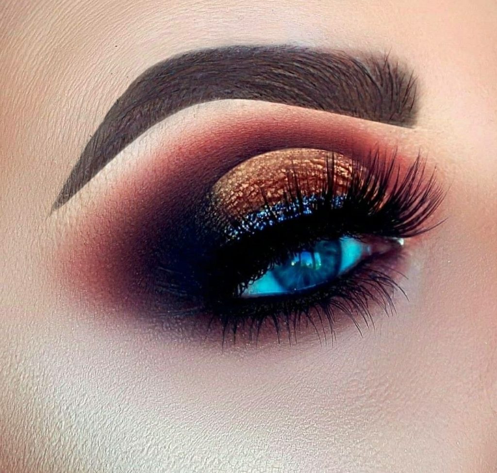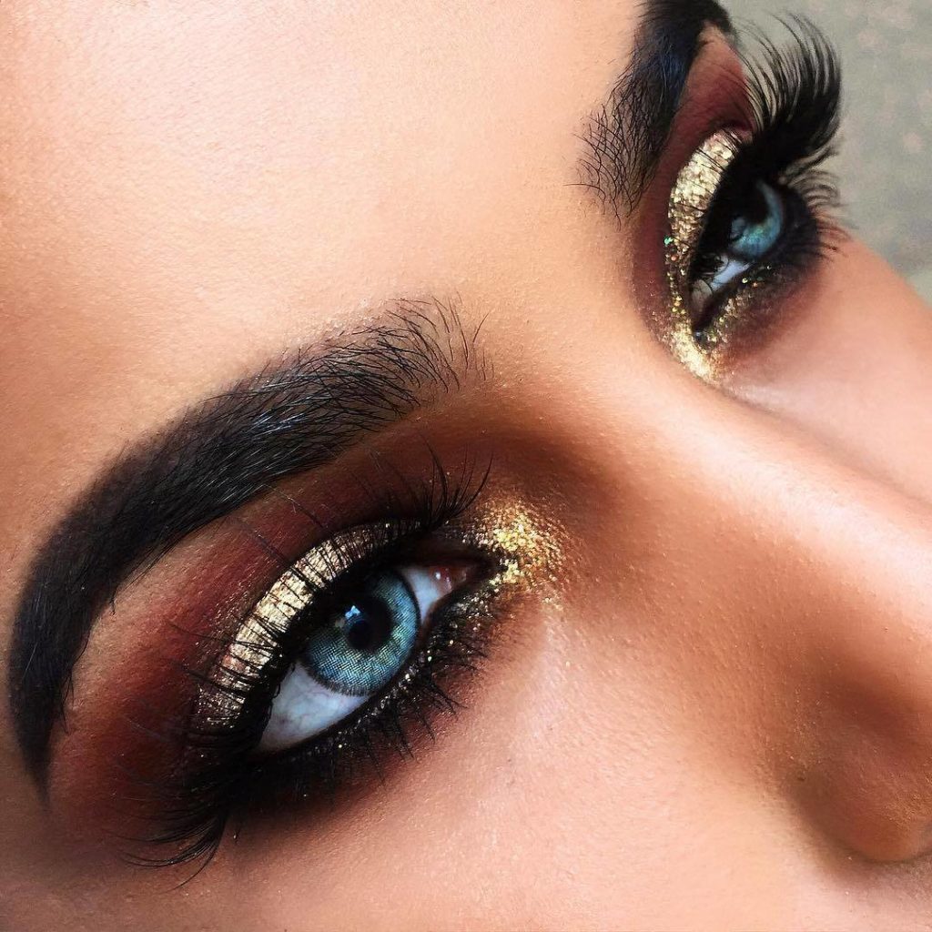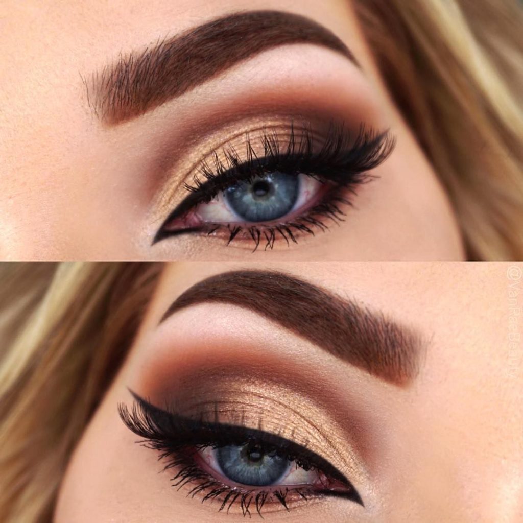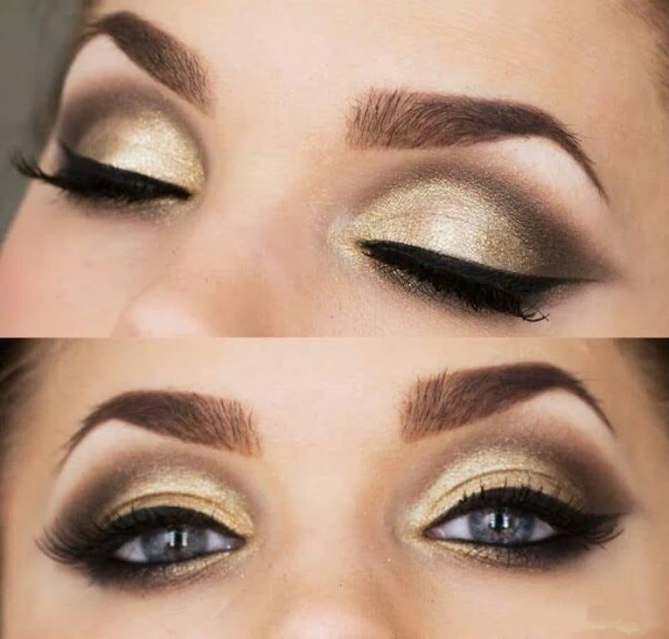 Il trucco dorato con la sua brillantezza attirerà ancora di più gli occhi blu così belli e chiari. La combinazione perfetta per il trucco dorato sarà marrone, bordeaux, sfumature di grigio dell'ombra. Il trucco può essere completato con una freccia nera opaca.