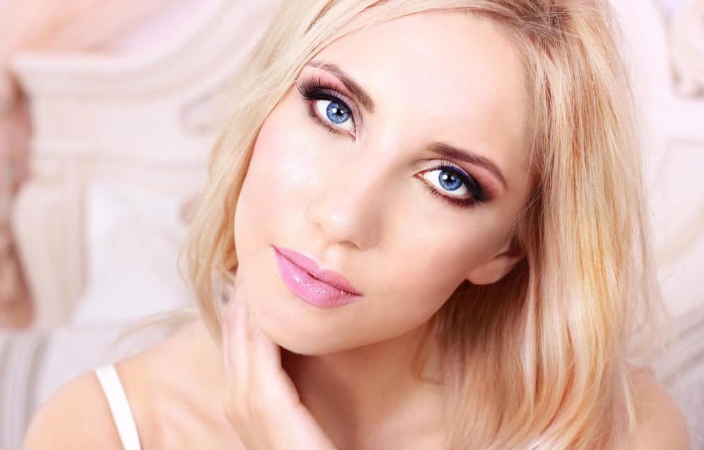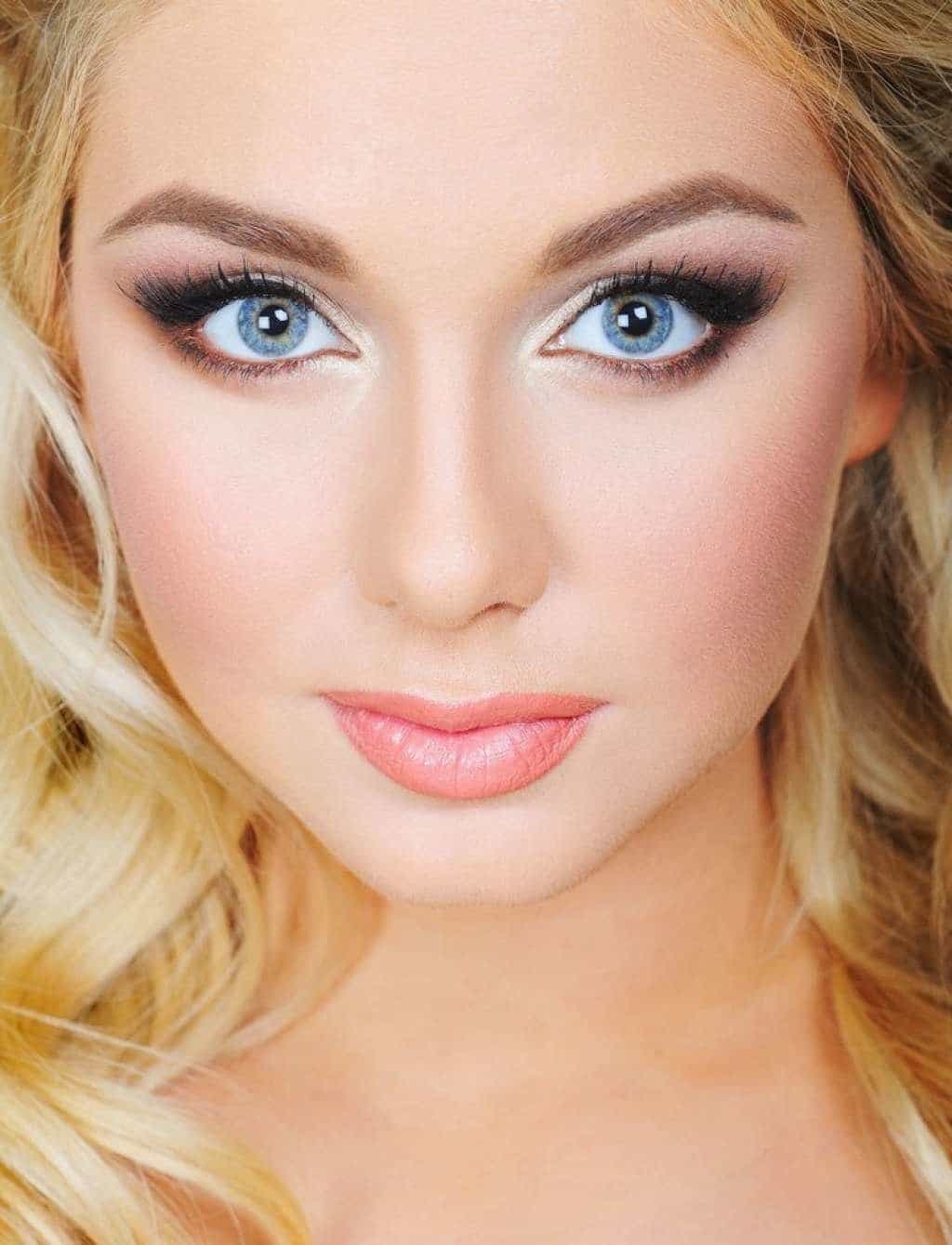 I proprietari di occhi blu sono generalmente biondi o con i capelli castani. Per un aspetto così delicato e riverente, le tonalità di tonalità pastello sono più adatte. In questo trucco, puoi usare pesca, beige, bianco, marrone chiaro, dorato, ecc. Il trucco può essere semplicemente semplice o leggermente oscurato con un angolo. La cosa principale è non usare tonalità troppo scure.