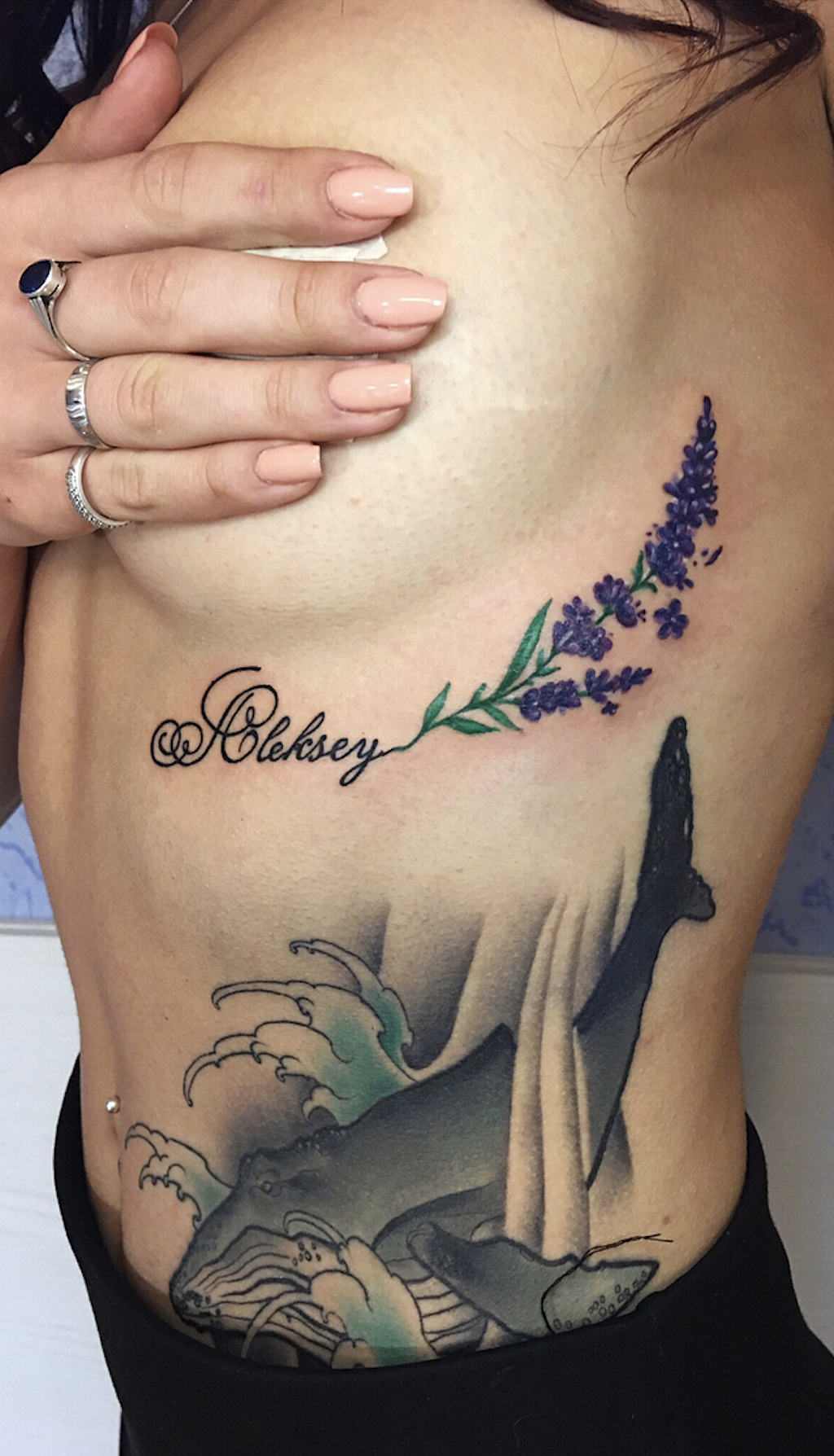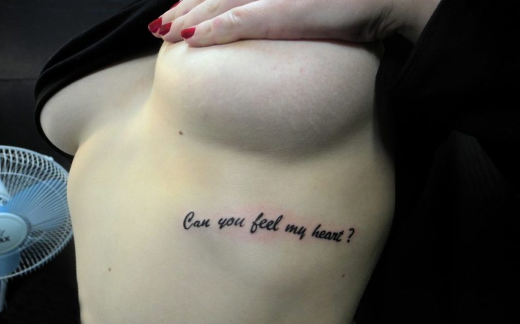 Alleen een persoon in uw buurt ziet zo'n tatoeage: een man of een man. Daarom wordt dit type tatoeage als verborgen beschouwd. Als het opschrift groot is, kan het onder je zwempak door gluren.