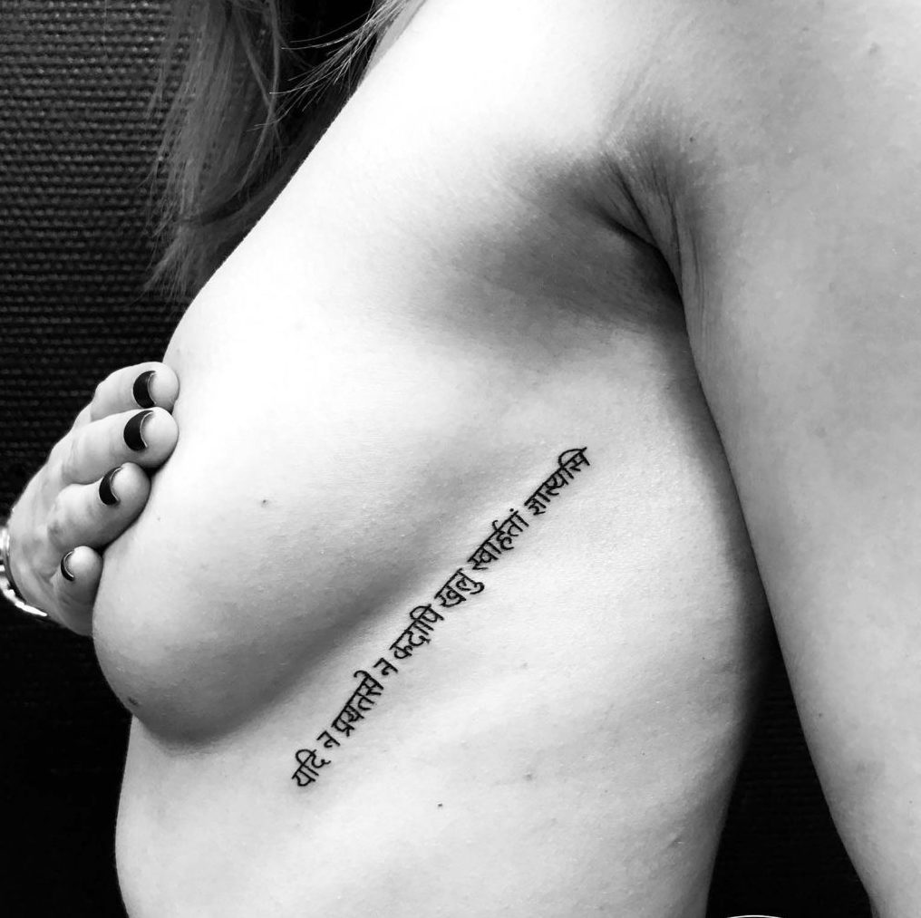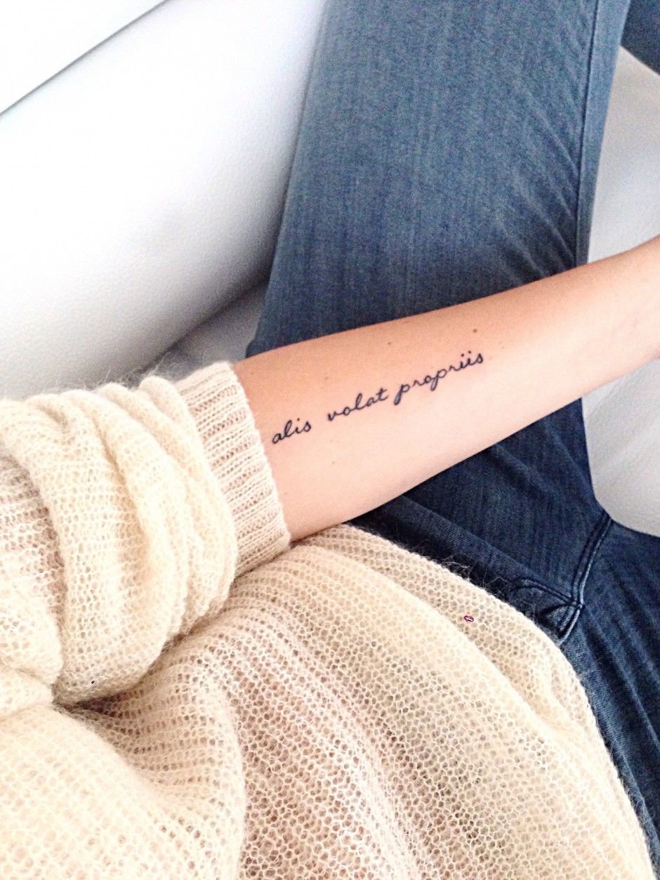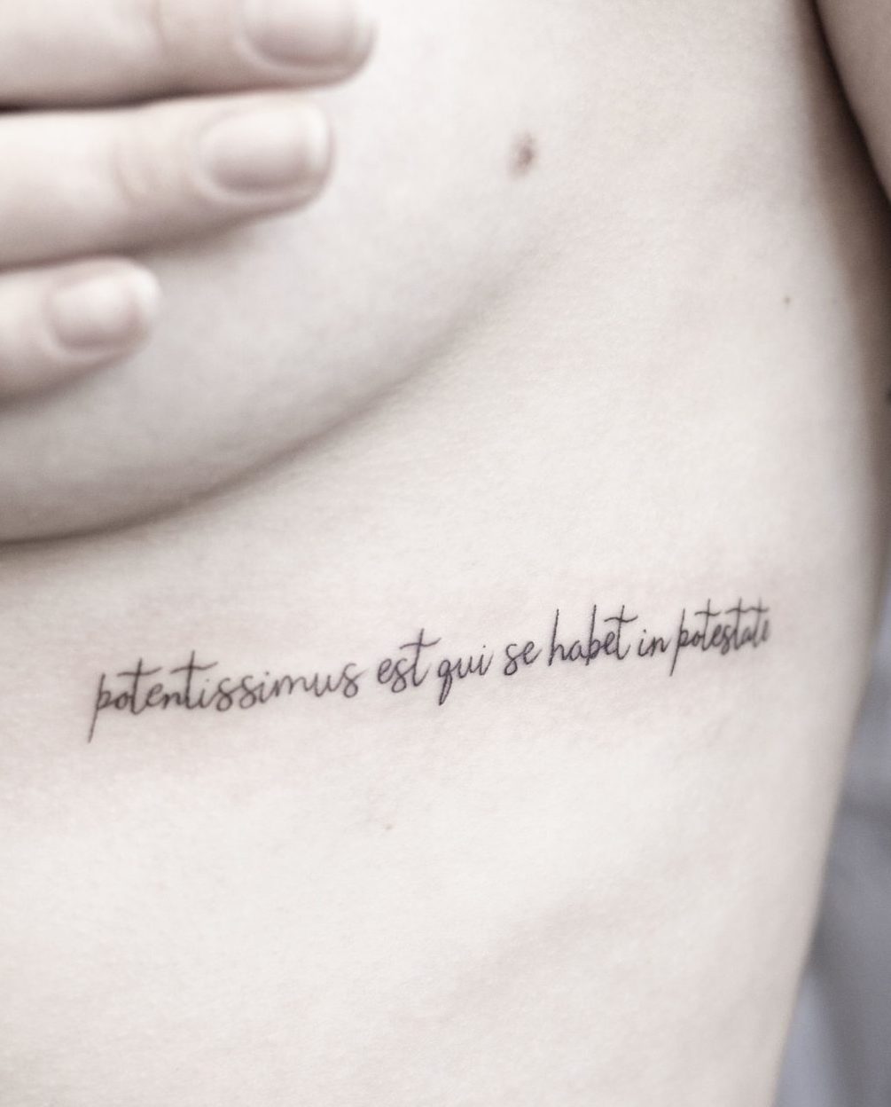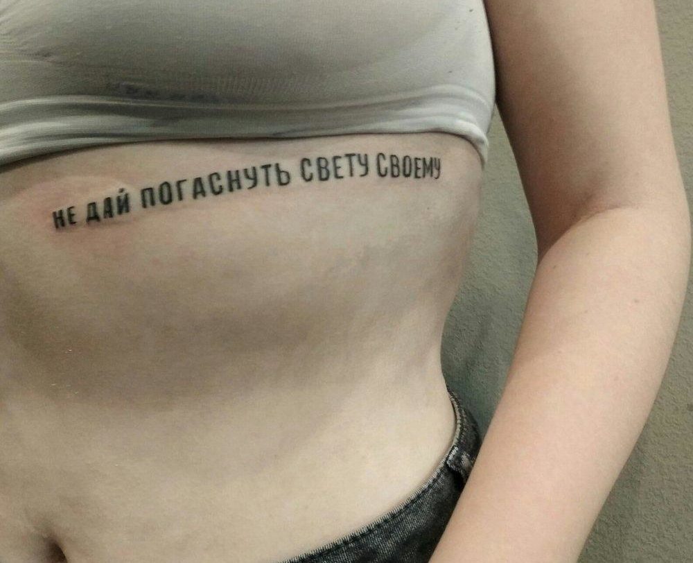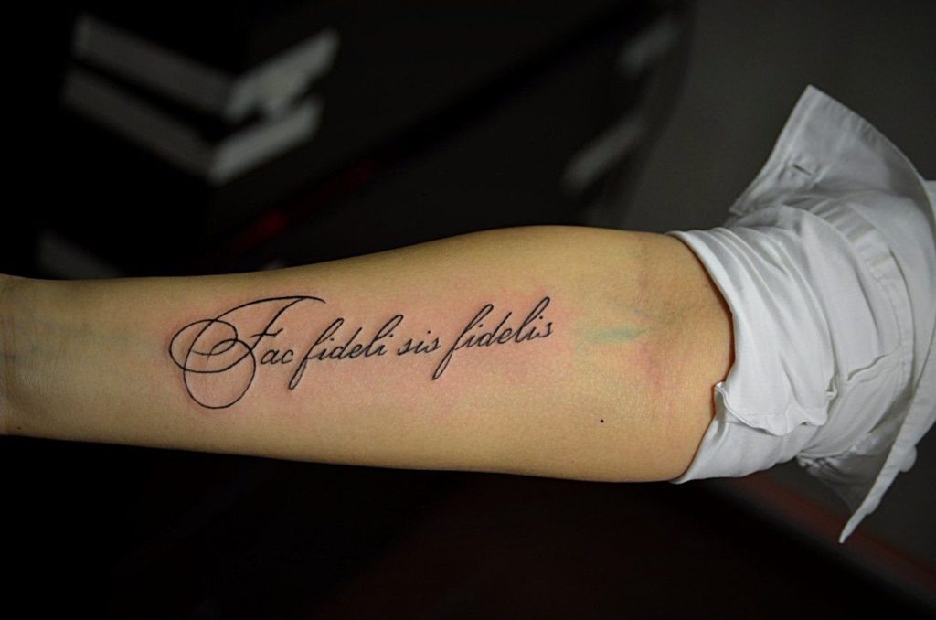 Het belangrijkste kenmerk van de tatoeage van de inscriptie is dat deze absoluut elke grootte kan worden gemaakt. In de ene versie kan het één woord zijn in elke taal en in een andere - een hele tekst in het Latijn. Hier is de exacte versie van de tekst die u nodig heeft al geselecteerd.