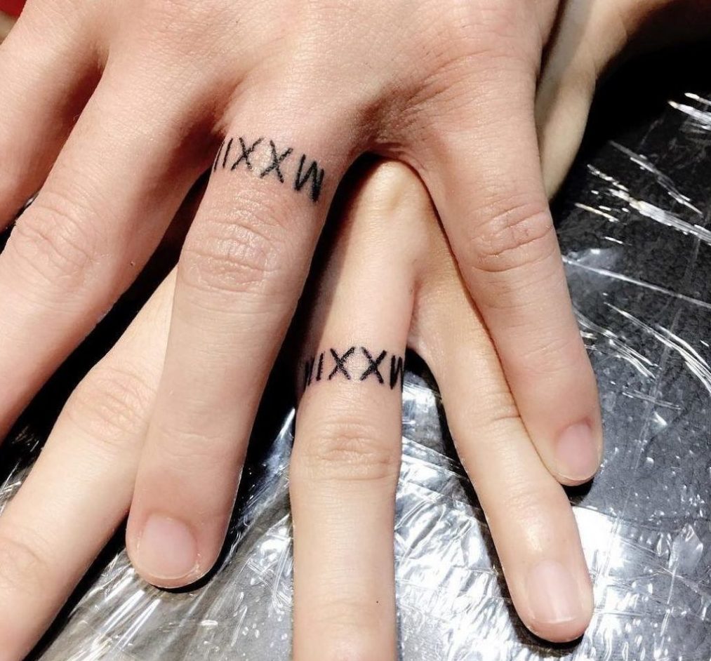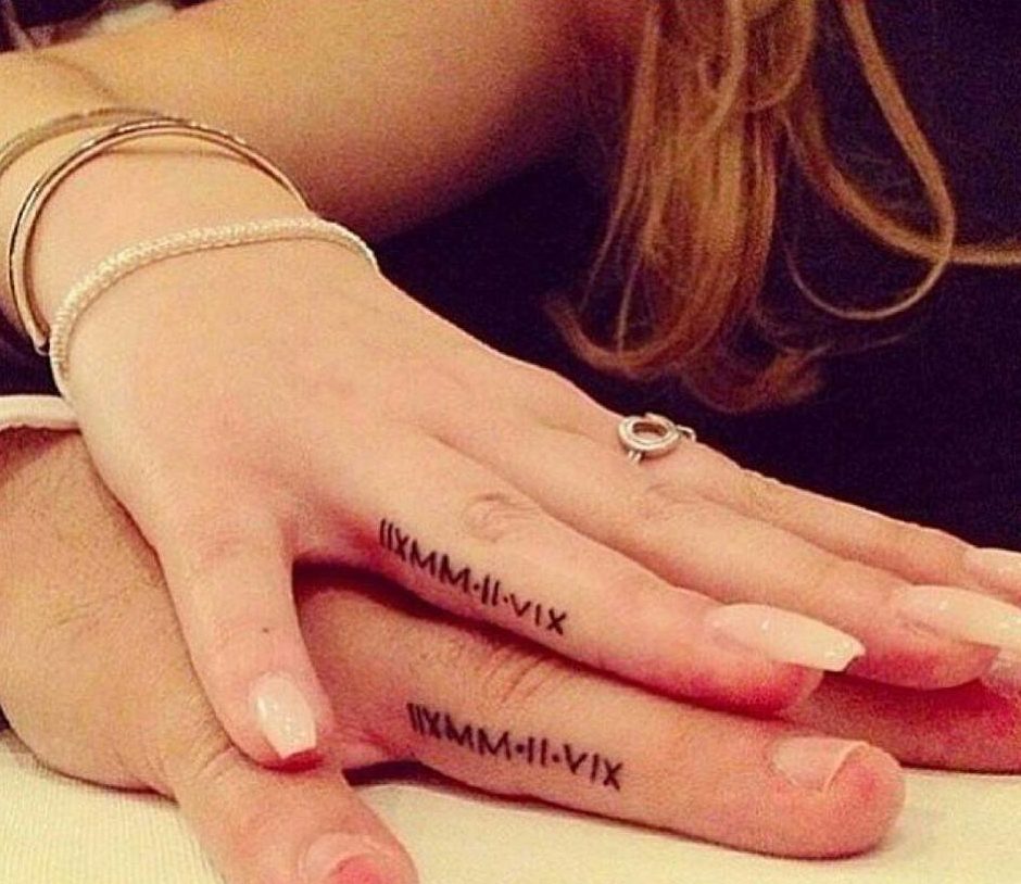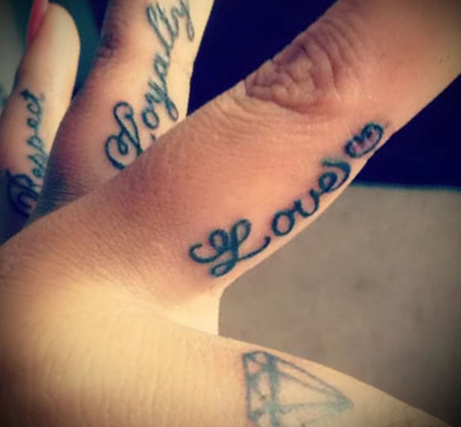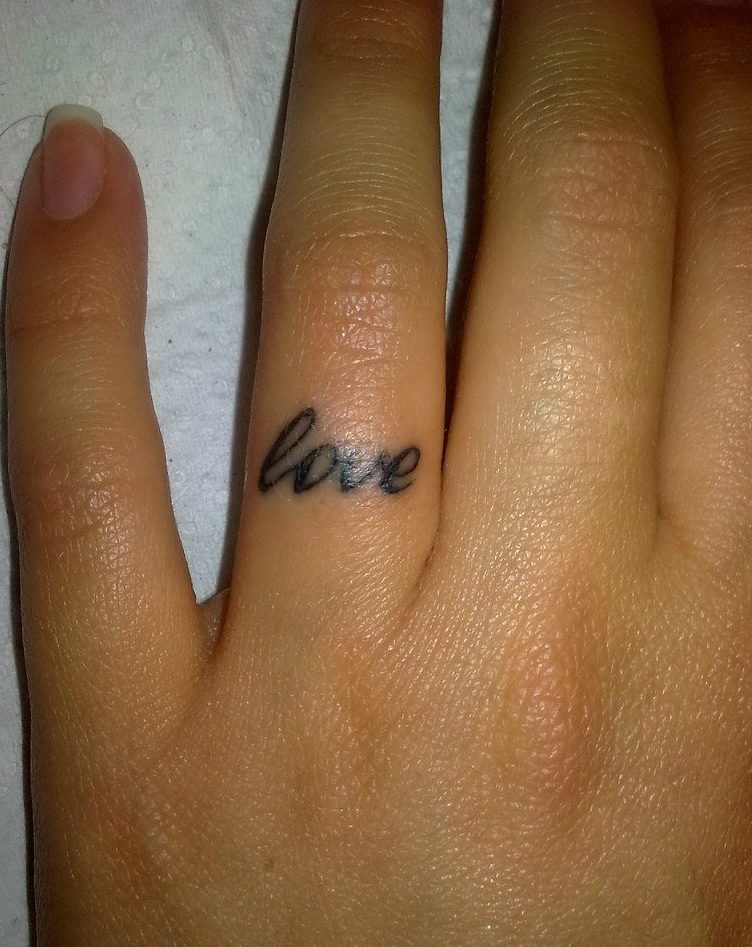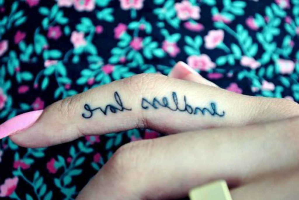 De tattoo-inscriptie op de vingers ziet er erg origineel uit. Vooral als je lange, dunne vingers hebt, kan het opschrift langs de vinger worden gedaan. Soms maken paren op deze manier een tatoeage waar de trouwring zou moeten zijn.