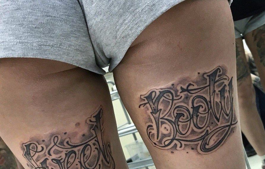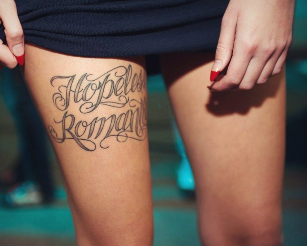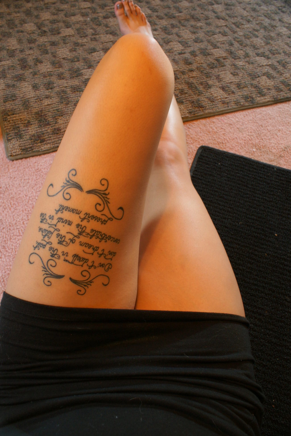 op dij Het is altijd een grote tatoeage waard. Omdat kleintjes er gewoon niet uitzien. Hieronder vind je foto's van voorbeelden van kleine en grote inscripties, en je moet gewoon kiezen wat je het leukst vindt.