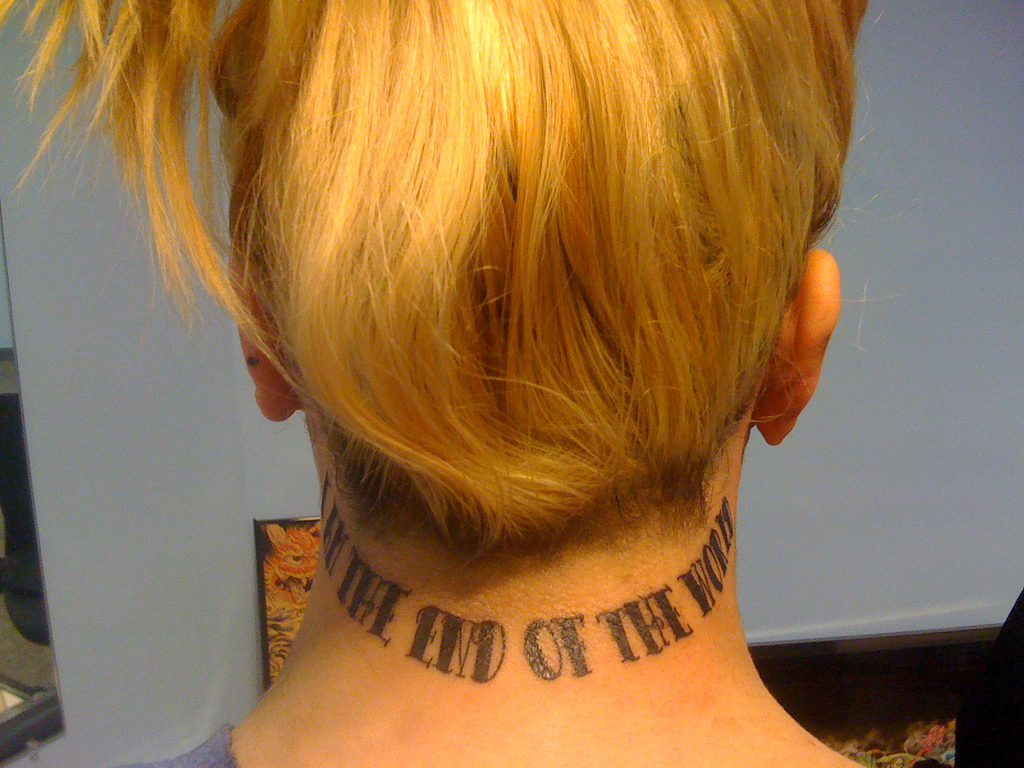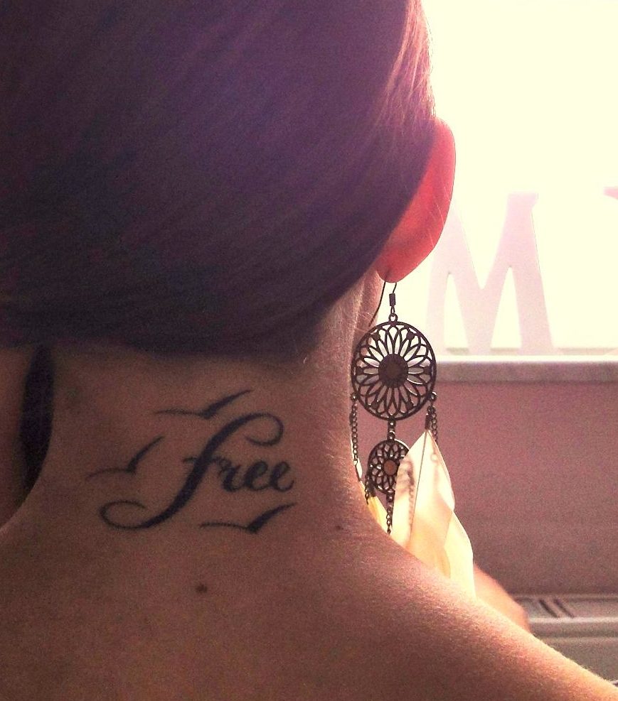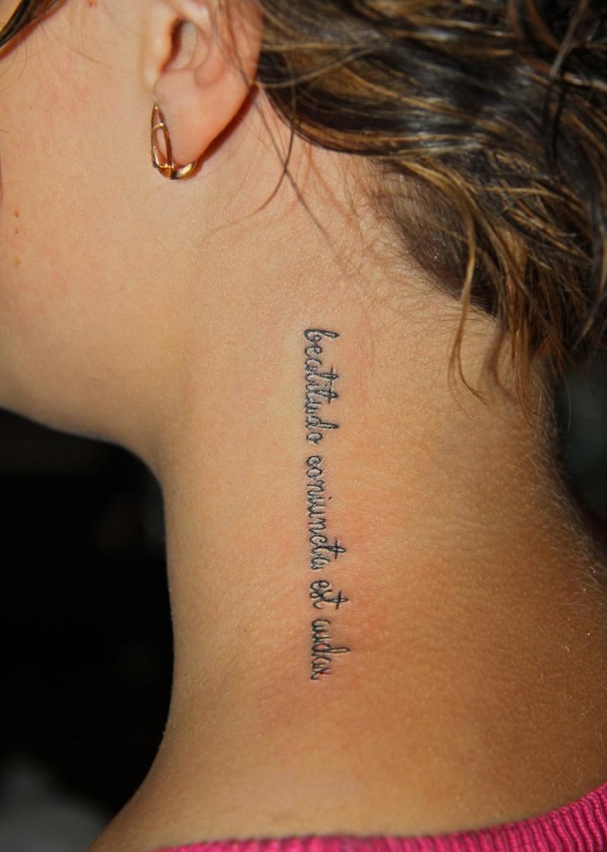 Om hun moeilijke en soms gedurfde en opvliegende karakter uit te drukken, kiezen veel meisjes een plek voor tattoo-inscripties in hun nek. Deze plek zal altijd duidelijk zichtbaar zijn, dus denk altijd na voordat je besluit zo'n stap te zetten.